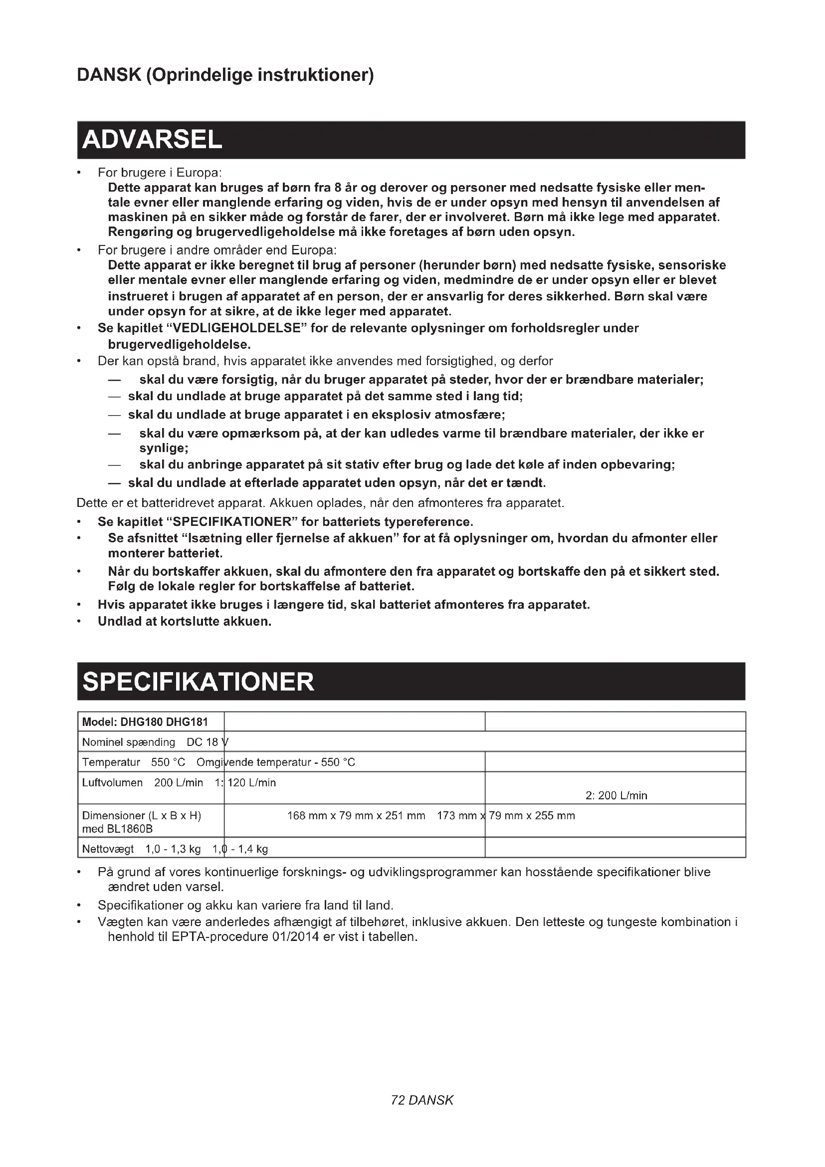 - Undlad at kortslutte akkuen. SPECIFIKATIONER Model: DHG180 DHG181 Nominelspænding DC18V Temperatur 550°C Omgivendetemperatur-550°C Luftvolumen 200L/min 1:120L/min 2:200L/min Dimensioner(LxBxH) medBL1860B 168mmx79mmx251mm 173mmx79mmx255mm Nettovægt 1,0-1,3kg 1,0-1,4kg