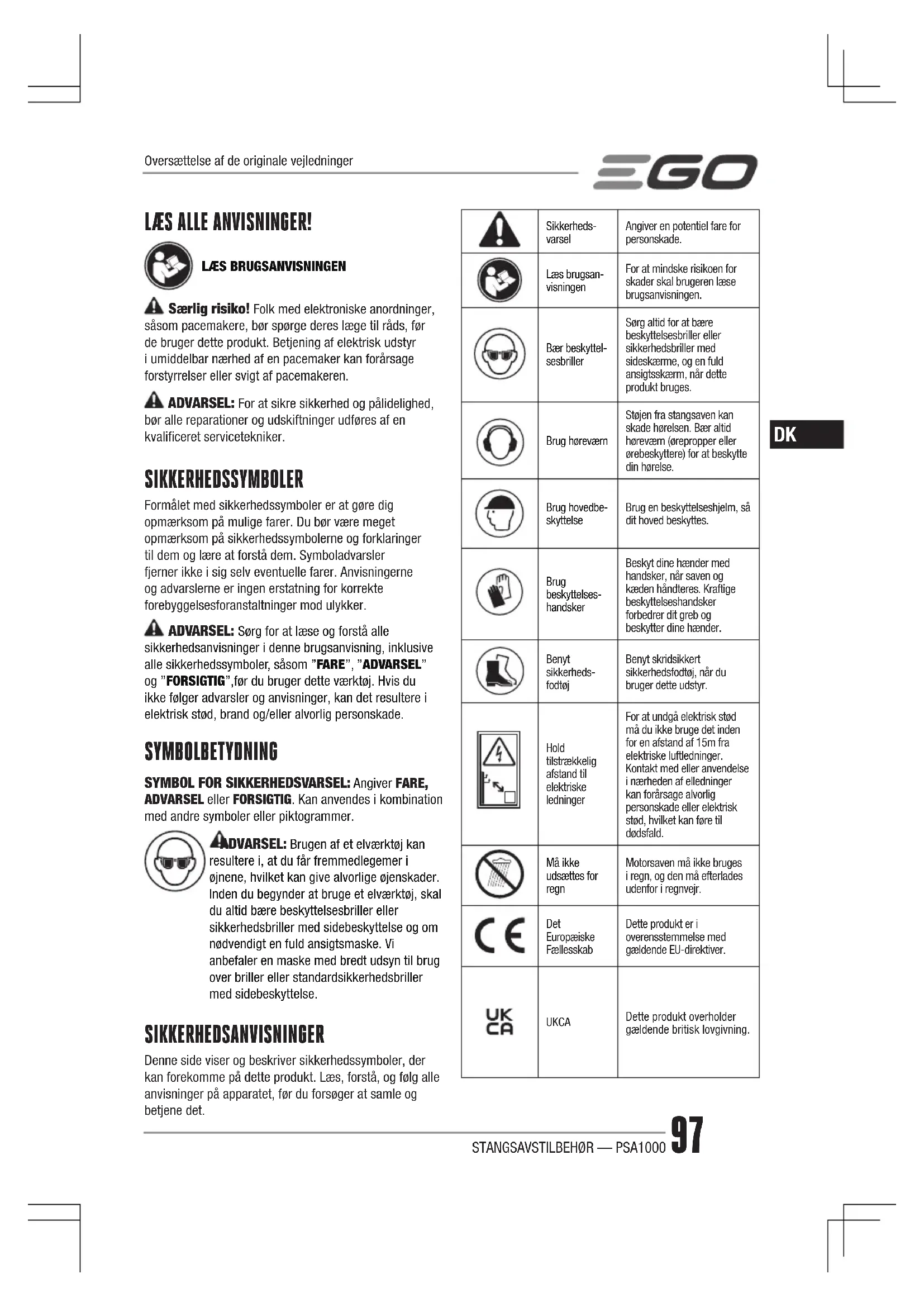 Særlig risiko! Folk med elektroniske anordninger, såsom pacemakere, bør spørge deres læge til råds, før de bruger dette produkt. Betjening af elektrisk udstyr i umiddelbar nærhed af en pacemaker kan forårsage forstyrrelser eller svigt af pacemakeren. ADVARSEL: For at sikre sikkerhed og pålidelighed, bør alle reparationer og udskiftninger udføres af en kvalificeret servicetekniker. SIKKERHEDSSYMBOLER Formålet med sikkerhedssymboler er at gøre dig opmærksom på mulige farer. Du bør være meget opmærksom på sikkerhedssymbolerne og forklaringer til dem og lære at forstå dem. Symboladvarsler fjerner ikke i sig selv eventuelle farer. Anvisningerne og advarslerne er ingen erstatning for korrekte forebyggelsesforanstaltninger mod ulykker. ADVARSEL: Sørg for at læse og forstå alle sikkerhedsanvisninger i denne brugsanvisning, inklusive alle sikkerhedssymboler, såsom ”FARE”, ”ADVARSEL” og ”FORSIGTIG”,før du bruger dette værktøj. Hvis du ikke følger advarsler og anvisninger, kan det resultere i elektrisk stød, brand og/eller alvorlig personskade. SYMBOLBETYDNING SYMBOL FOR SIKKERHEDSVARSEL: Angiver FARE, ADVARSEL eller FORSIGTIG. Kan anvendes i kombination med andre symboler eller piktogrammer. ADVARSEL: Brugen af et elværktøj kan resultere i, at du får fremmedlegemer i øjnene, hvilket kan give alvorlige øjenskader. Inden du begynder at bruge et elværktøj, skal du altid bære beskyttelsesbriller eller sikkerhedsbriller med sidebeskyttelse og om nødvendigt en fuld ansigtsmaske. Vi anbefaler en maske med bredt udsyn til brug over briller eller standardsikkerhedsbriller med sidebeskyttelse. SIKKERHEDSANVISNINGER Denne side viser og beskriver sikkerhedssymboler, der kan forekomme på dette produkt. Læs, forstå, og følg alle anvisninger på apparatet, før du forsøger at samle og betjene det. Sikkerheds-varselAngiver en potentiel fare for personskade.Læs brugsan-visningenFor at mindske risikoen for skader skal brugeren læse brugsanvisningen.Bær beskyttel-sesbrillerSørg altid for at bære beskyttelsesbriller eller sikkerhedsbriller med sideskærme, og en fuld ansigtsskærm, når dette produkt bruges.Brug høreværnStøjen fra stangsaven kan skade hørelsen. Bær altid høreværn (ørepropper eller ørebeskyttere) for at beskytte din hørelse.Brug hovedbe-skyttelseBrug en beskyttelseshjelm, så dit hoved beskyttes.Brug beskyttelses-handskerBeskyt dine hænder med handsker, når saven og kæden håndteres. Kraftige beskyttelseshandsker forbedrer dit greb og beskytter dine hænder.Benyt sikkerheds-fodtøjBenyt skridsikkert sikkerhedsfodtøj, når du bruger dette udstyr.Hold tilstrækkelig afstand til elektriske ledningerFor at undgå elektrisk stød må du ikke bruge det inden for en afstand af 15m fra elektriske luftledninger. Kontakt med eller anvendelse i nærheden af elledninger kan forårsage alvorlig personskade eller elektrisk stød, hvilket kan føre til dødsfald.Må ikke udsættes for regn Motorsaven må ikke bruges i regn, og den må efterlades udenfor i regnvejr. Det Europæiske FællesskabDette produkt er i overensstemmelse med gældende EU-direktiver. UKCA Dette produkt overholder gældende britisk lovgivning. Oversættelse af de originale vejledningerSTANGSAVSTILBEHØR — PSA100098