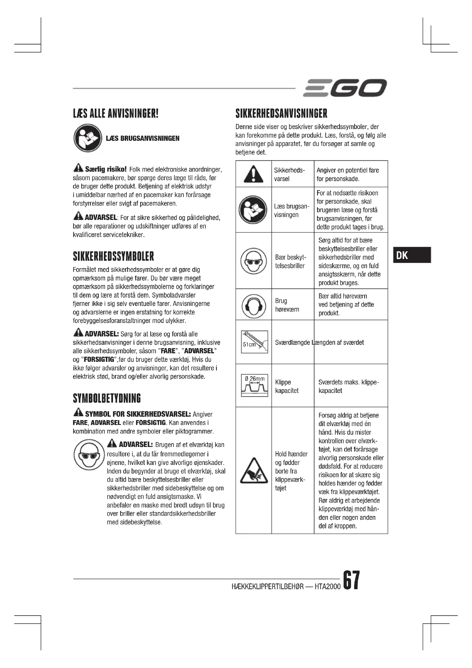 ◾ Ved situationer, der ikke er dækket i denne vejledning: Vær forsigtig, og arbejd med omtanke. Kontakt EGO’s servicecenter for at få hjælp. ◾ Gem disse anvisninger. Brug dem ofte, og brug dem til at instruere andre, der skal bruge dette værktøj. Hvis du låner nogen dette værktøj, så lad dem få anvisningerne med, så de også undgår fejlbrug af produktet og mulig personskade.