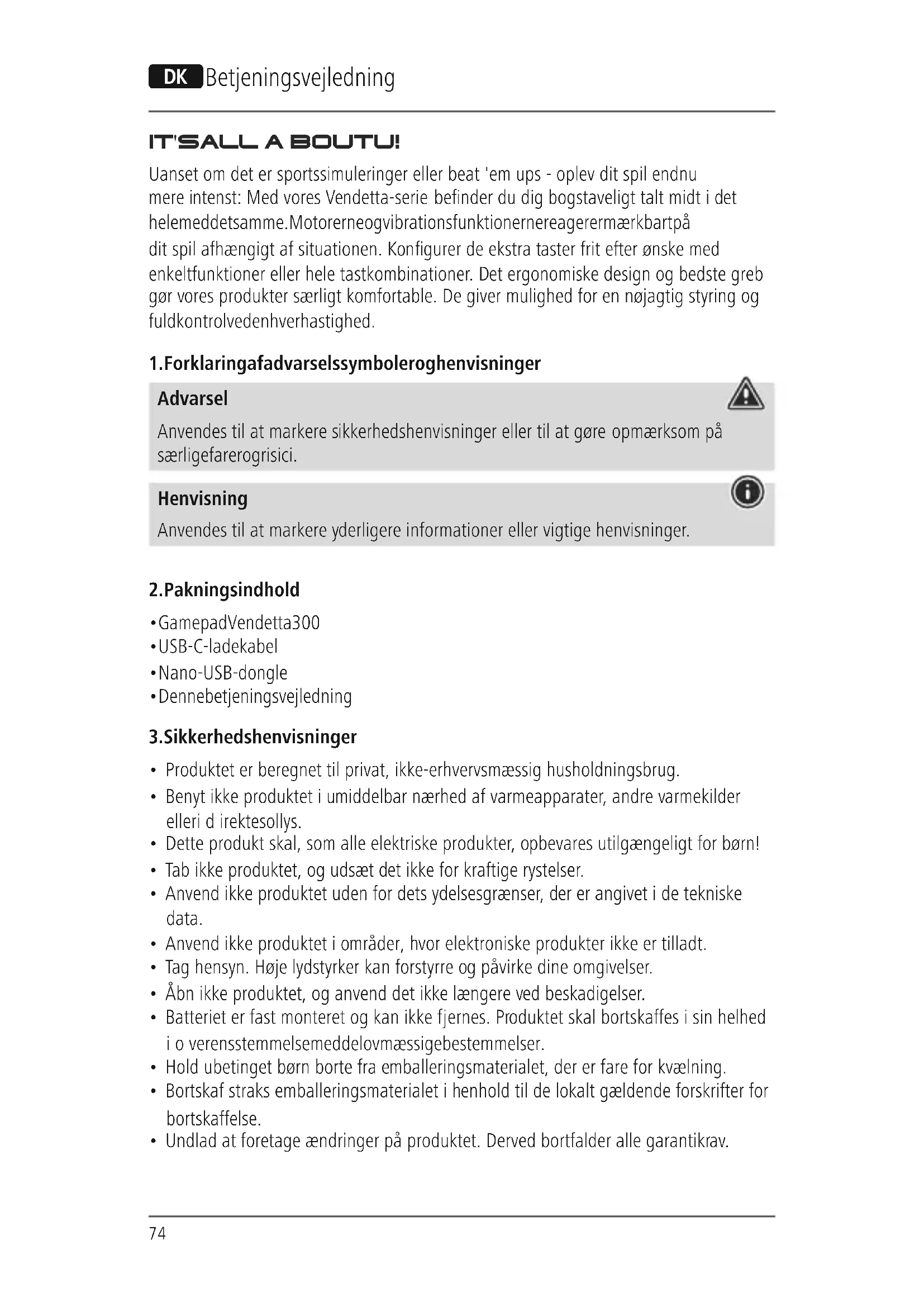 Hama GmbH &CoKGvakuuttaa, että radiolaitetyyppi [00186075] on direktiivin 2014/53/EU mukainen. EU-vaatimustenmukaisuusvakuutuksen täysimittainen teksti on saatavilla seuraavassa internet-osoitteessa: www.hama.com->00186075->Downloads. Taajuusalue/taajuusalueet 2400–2483 MHz Suurin mahdollinen lähetysteho 0dBm74 K Betjeningsvejledning IT'S ALLABOUT U! Uanset om det er sportssimuleringer eller beat 'em ups -oplev dit spil endnu mereintenst: Med vores Vendetta-serie bender du dig bogstaveligt talt midt idet hele med det samme. Motorerne og vibrationsfunktionerne reagerer mærkbart på dit spil afhængigt af situationen. Kongurer de ekstrataster frit efter ønske med enkeltfunktioner eller hele tastkombinationer.Det ergonomiske design og bedste greb gørvores produkter særligt komfortable. De giver mulighed for en nøjagtig styring og fuld kontrol ved enhver hastighed.