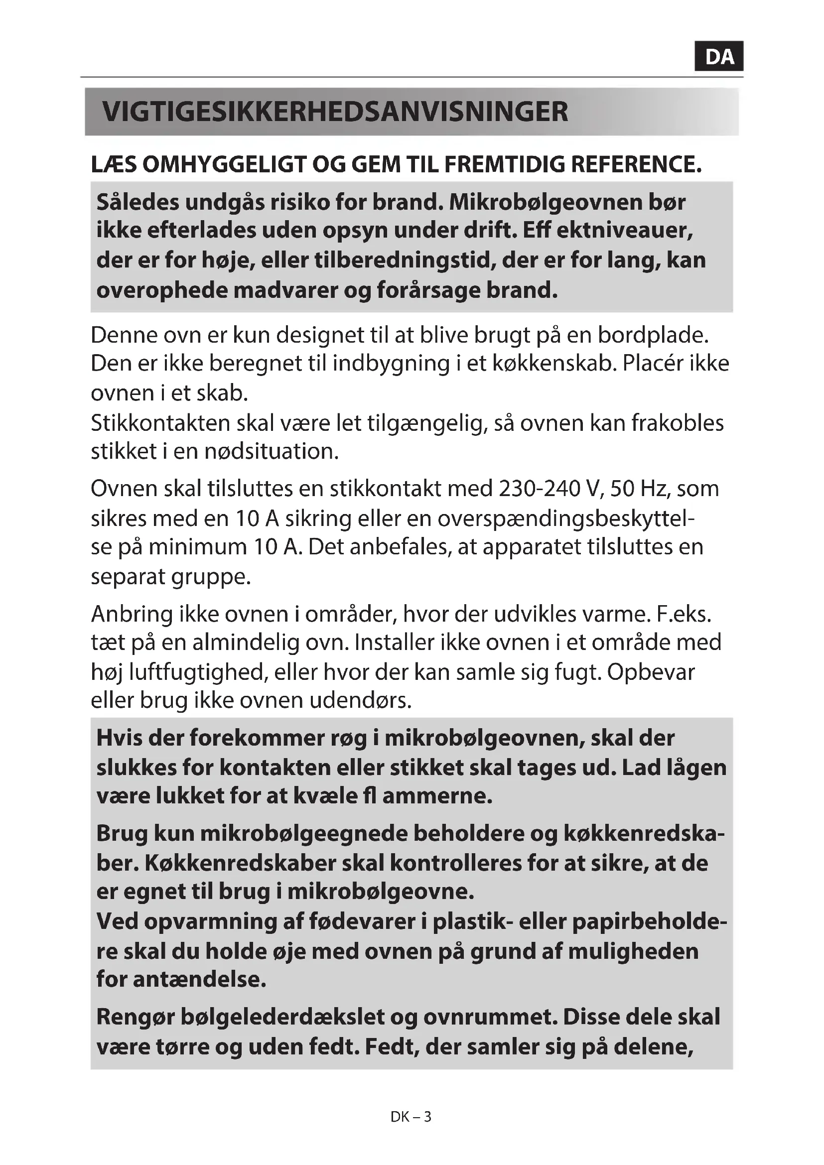 - - Kun for modeller med grill.DA DK – 3 DK – 3 VIGTIGE SIKKERHEDSANVISNINGER LÆS OMHYGGELIGT OG GEM TIL FREMTIDIG REFERENCE. Således undgås risiko for brand. Mikrobølgeovnen bør ikke efterlades uden opsyn under drift. Eff ektniveauer, der er for høje, eller tilberedningstid, der er for lang, kan overophede madvarer og forårsage brand. Denne ovn er kun designet til at blive brugt på en bordplade. Den er ikke beregnet til indbygning i et køkkenskab. Placér ikke ovnen iet skab. Stikkontakten skal være let tilgængelig, så ovnen kan frakobles stikket i en nødsituation. Ovnen skal tilsluttes en stikkontakt med 230-240 V, 50 Hz, som sikres med en 10 A sikring eller en overspændingsbeskyttel- se på minimum 10 A. Det anbefales, at apparatet tilsluttes en separat gruppe. Anbring ikke ovnen i områder, hvor der udvikles varme. F.eks. tæt på en almindelig ovn. Installer ikke ovnen i et område med høj luftfugtighed, eller hvor der kan samle sig fugt. Opbevar eller brug ikke ovnen udendørs. Hvis der forekommer røg i mikrobølgeovnen, skal der slukkes for kontakten eller stikket skal tages ud. Lad lågen være lukket for at kvæle ammerne. Brug kun mikrobølgeegnede beholdere og køkkenredska- ber. Køkkenredskaber skal kontrolleres for at sikre, at de er egnet til brug i mikrobølgeovne. Ved opvarmning af fødevarer i plastik- eller papirbeholde- re skal du holde øje med ovnen på grund af muligheden for antændelse. Rengør bølgelederdækslet og ovnrummet. Disse dele skal være tørre og uden fedt. Fedt, der samler sig på delene,DK – 4 DK – 4 kan blive overophedede og begynde at ryge eller bryde i brand. Stil ikke brændbare genstande nær ved ovnen eller dens venti- lationsåbninger. Bloker ikke ventilationsåbningerne. Fjern forseglinger af metal, lukkebånd osv. fra maden og ind- pakningerne. Buedannelse på metalover ader kan resultere i ild. Anvend ikke mikrobølgeovnen for at varme fritureolie op. Det er ikke muligt at kontrollere temperaturen og olien kan antæn- de. Hvis du påtænker at lave popcorn, skal du anvende specielle popcornsbeholdere for mikrobølgeovne. Opbevar ikke mad eller andet inde i ovnen. Kontrollér indstillingerne, når du starter ovnen, for at være sik- ker på, at den anvendes korrekt. Efterlad ikke ovnen uden opsyn, når den er i brug. Vær ekstra opmærksom, når madretter med højt sukkerindhold eller fedtindhold tilberedes eller genopvarmes, for eksempel, pølsehorn, tærter eller budding. Risiko for overophedning eller brand. Se de tilsvarende f i brugervejledningen. Sådan undgås risiko for skader. ADVARSEL: Anvend ikke ovnen, hvis den er beskadiget eller ikke fungerer rigtigt. Kontroller følgende, inden ovnen anvendes: a) Kontroller, at ovnlågen lukker korrekt, og at den ikke hæn- ger på skrå eller er skæv. b) Kontroller, at hængslerne og sikkerhedslåsene på lågen ikke er knækkede eller løse. c) Sørg for, at ovnlågens tætninger og tætningsover ader ikke er beskadigede.DA DK – 5 DK – 5 d) Kontroller, at ovnens og ovnlågens indvendige sider ikke har nogen buler. e) Sørg for, at netledningen og stikkontakten ikke er beskadi- gede. Mikrobølgeovnen må ikke anvendes, hvis lågen eller hængs- lerne er beskadigede. Ovnen skal først repareres af en kompe- tent tekniker før videre anvendelse. Forsøg aldrig selv at justere, reparere eller modi cere ovnen. Det kan være farligt for personer uden specielle kundskaber at udføre service eller reparere ovnen, da dette kræver, at kapper, som beskytter mod farlig mikro- bølgeenergi, ernes. Anvend ikke ovnen, hvis ovnlågen er åben, og forsøg ikke at ændre på ovnlågens sikkerhedslåseklinker på nogen måde. Anvend ikke ovnen, hvis der sidder noget i klemme mellem ovnlågens tætningslister og kontakt aderne. Tillad ikke fedt og snavs at opbygges på lågens pakninger og tilstødende dele. Rengør oven med regelmæssige mel- lemrum og ern fødevarea ejringer. Følg instruktionerne om “Pleje og rengøring”. Hvis ovnen ikke holdes ren, kan det føre til ødelæggelse af over a- den, der kan påvirke apparatets levetid og eventuelt føre til en farlig situation. Personer, som anvender PACEMAKER, skal spørge en læge eller pacemakerproducenten til råds angående anvendelse af mikro- bølgeovne. Sådan undgås risiko for elektrisk stød.