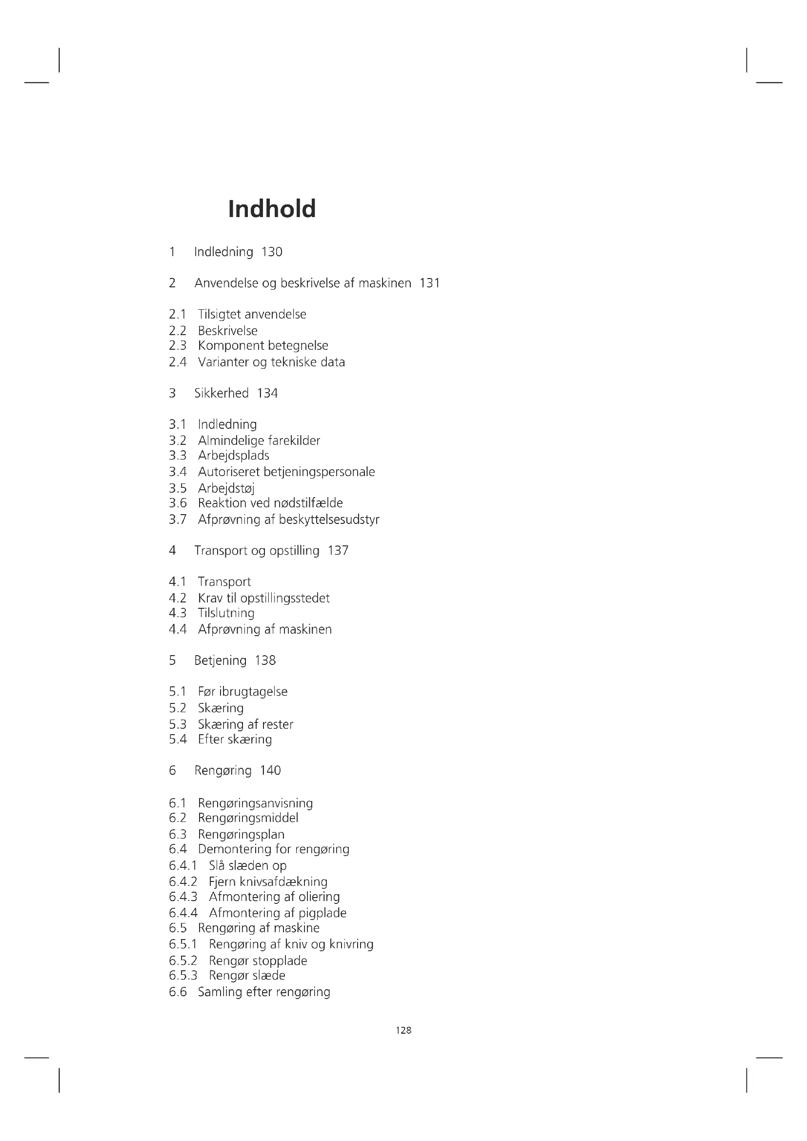 FARE Når kniven står stille eller roterer, er der risiko for snitsår eller afskæring. Når maskinen ikke er i drift, skal stoppladen altid stå på nul. FARE Maskinen kommer med strømforsyning 230 V, og må derfor ikke åbnes. Jordingssyste- met skal altid være slået til, da der ellers kan opstå risiko for alvorlige strømstød. FARE Vær opmærksom på magnetiske- og elektromagnetiske felter! Før personer med aktive implantater (pacemaker osv.) opholder sig i nærheden af maskinen, eller betjener denne, skal der udføres en individuel risikovurdering af en sagkyndig på stedet, virksomhedslægen og eventuelt en kardiolog. ADVARSEL Når slæden vippes kan en hånd blive klemt. Hold derfor den hånd væk fra maskinen som ikke bruges til betjening. FORSIGTIG I nærheden af resteholderen er der risiko for kvæstelser i kraft af piggene og ved tab af resteholderen under ilægning. FORSIGTIG Ved montering af komponenter der kan fjernes under rengøring. 3 Sikkerhed135