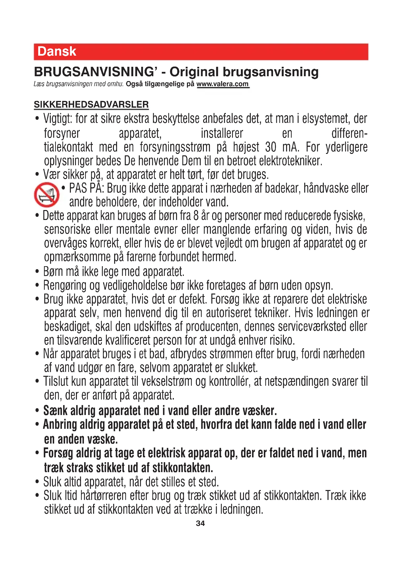 umaa ilmaa. la tai vältä a hiuksia ja le 70 dB(A). 00060819 2021_09_Layout 1 24/09/2021 15:01 Pagina 3334 Vigtigt Denne hårtørrer s apparater. Denne hårtørrer e overophedning sto den at fungere ige luftindgangs- og u Dette apparat er direktiver 2014/30/ 2009/125/EC, 201 BRUGSANV Omskiftning ( model) Model 530.., 533 ON= tændt/slukke fungere) 0=slukket COOL= varm luft 1=varm luft / let 2=meget varm lu Model 543., 545., 5 Luftstrøm 0=slukket 1=let luftstrøm 2=kraftig luftstrøm Dansk BRUGSANVISNING’ - Original brugsanvisning Læs brugsanvisningen med omhu. Også tilgængelige på www.valera.com SIKKERHEDSADVARSLER