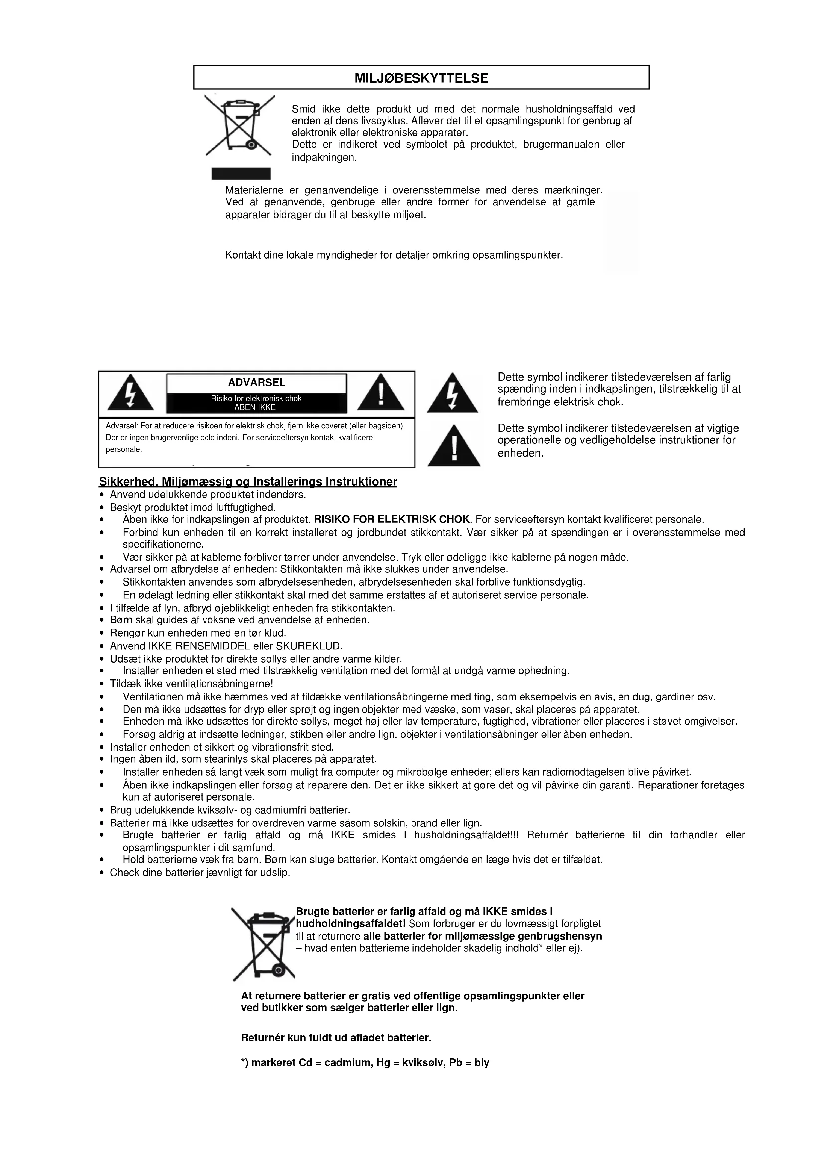 - Brugte batterier er farlig affald og ma IKKE smides I husholdningsaffaldet!!! Returner batterierne til din forhandler ull opsamlingspunkter i dit samfund.