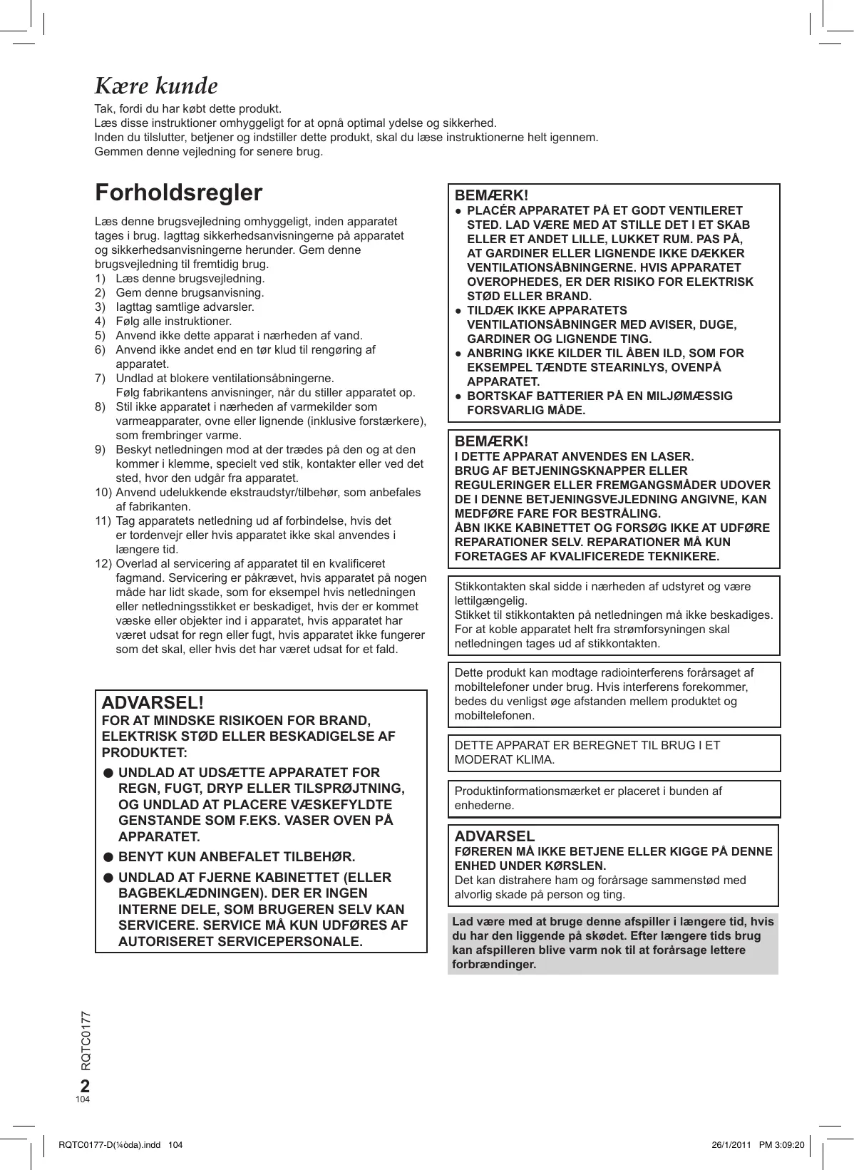 RQTC0177-D(¼òDU).indd 103 28/1/2011 AM 9:42:07 Kære kunde Tak, fordi du har købt dette produkt. Læs disse instruktioner omhyggeligt for at opnå optimal ydelse og sikkerhed. Inden du tilslutter, betjener og indstiller dette produkt, skal du læse instruktionerne helt igennem. Gemmen denne vejledning for senere brug. Forholdsregler Læs denne brugsvejledning omhyggeligt, inden apparatet tages i brug. Iagttag sikkerhedsanvisningerne på apparatet og sikkerhedsanvisningerne herunder. Gem denne brugsvejledning til fremtidig brug.
