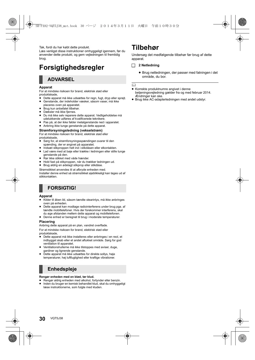 2 Netledning ≥ Brug netledningen, der passer med fatningen i det område, du bor. ≥ Korrekte produktnumre angivet i denne betjeningsvejledning gælder fra og med februar 2014. Ændringer kan ske. ≥ Brug ikke AC-adapterledningen med andet udstyr. SH-FX82-VQT5J38_mst.book 31 ページ