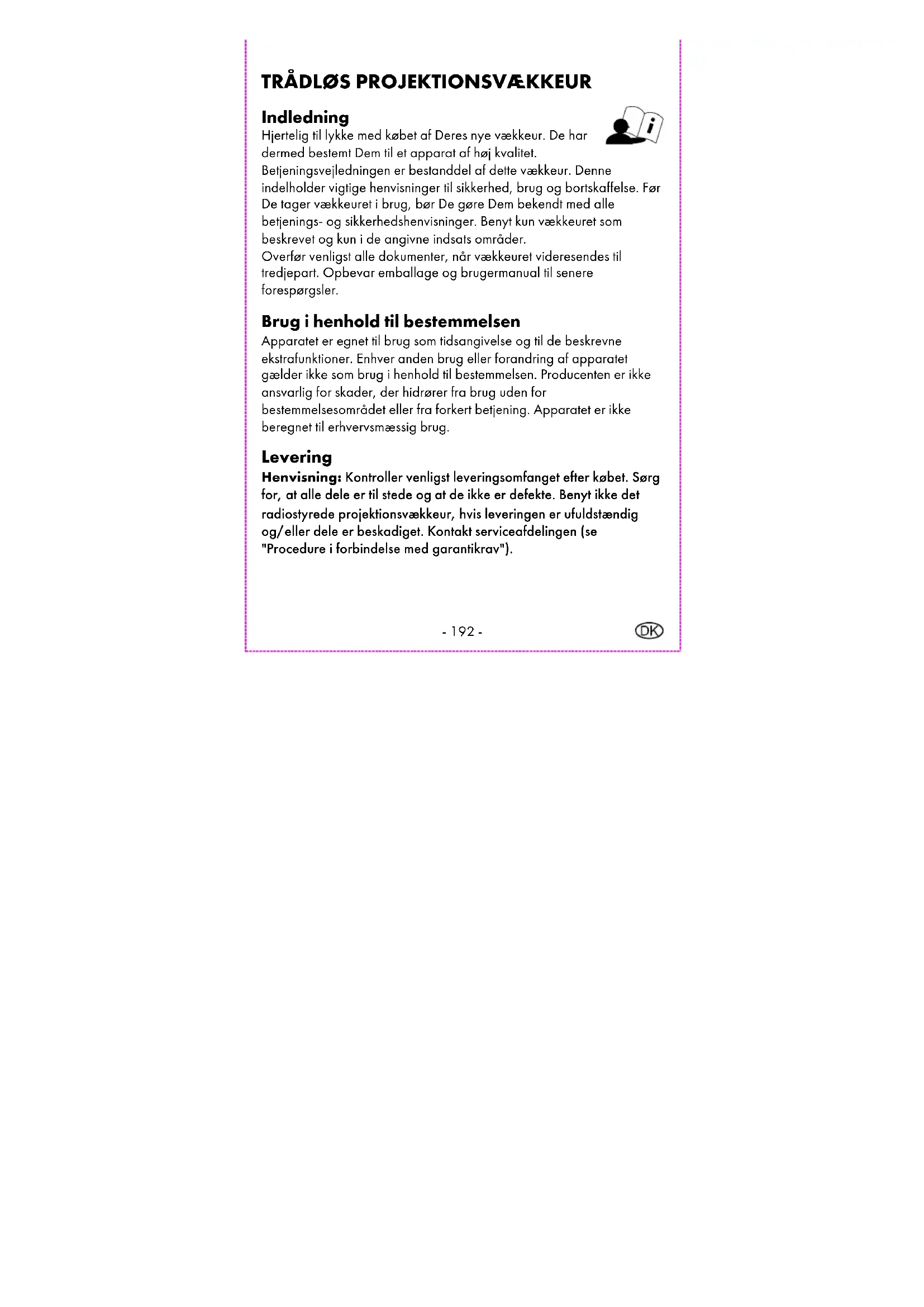 Indledning Hjertelig til lykke med købet af Deres nye vækkeur. De har dermed bestemt Dem til et apparat af høj kvalitet. Betjeningsvejledningen er bestanddel af dette vækkeur. Denne indelholder vigtige henvisninger til sikkerhed, brug og bortskaffelse. Før De tager vækkeuret i brug, bør De gøre Dem bekendt med alle betjenings- og sikkerhedshenvisninger. Benyt kun vækkeuret som beskrevet og kun i de angivne indsats områder. Overfør venligst alle dokumenter, når vækkeuret videresendes til tredjepart. Opbevar emballage og brugermanual til senere forespørgsler. Brug i henhold til bestemmelsen Apparatet er egnet til brug som tidsangivelse og til de beskrevne ekstrafunktioner. Enhver anden brug eller forandring af apparatet gælder ikke som brug i henhold til bestemmelsen. Producenten er ikke ansvarlig for skader, der hidrører fra brug uden for bestemmelsesområdet eller fra forkert betjening. Apparatet er ikke beregnet til erhvervsmæssig brug. Levering Henvisning: Kontroller venligst leveringsomfanget efter købet. Sørg for, at alle dele er til stede og at de ikke er defekte. Benyt ikke det radiostyrede projektionsvækkeur, hvis leveringen er ufuldstændig og/eller dele er beskadiget. Kontakt serviceafdelingen (se "Procedure i forbindelse med garantikrav").- 193 - 1 x radiostyret projektionsvækkeur 1 x strømforsyning 2 x alkaliske batterier 1,5 V AA LR6 1 stk. betjeningsvejledning Tekniske specifikationer Radiostyret projektionsvækkeur DCF77-radiotid Mål: ca. 130 x 98 x 45 mm