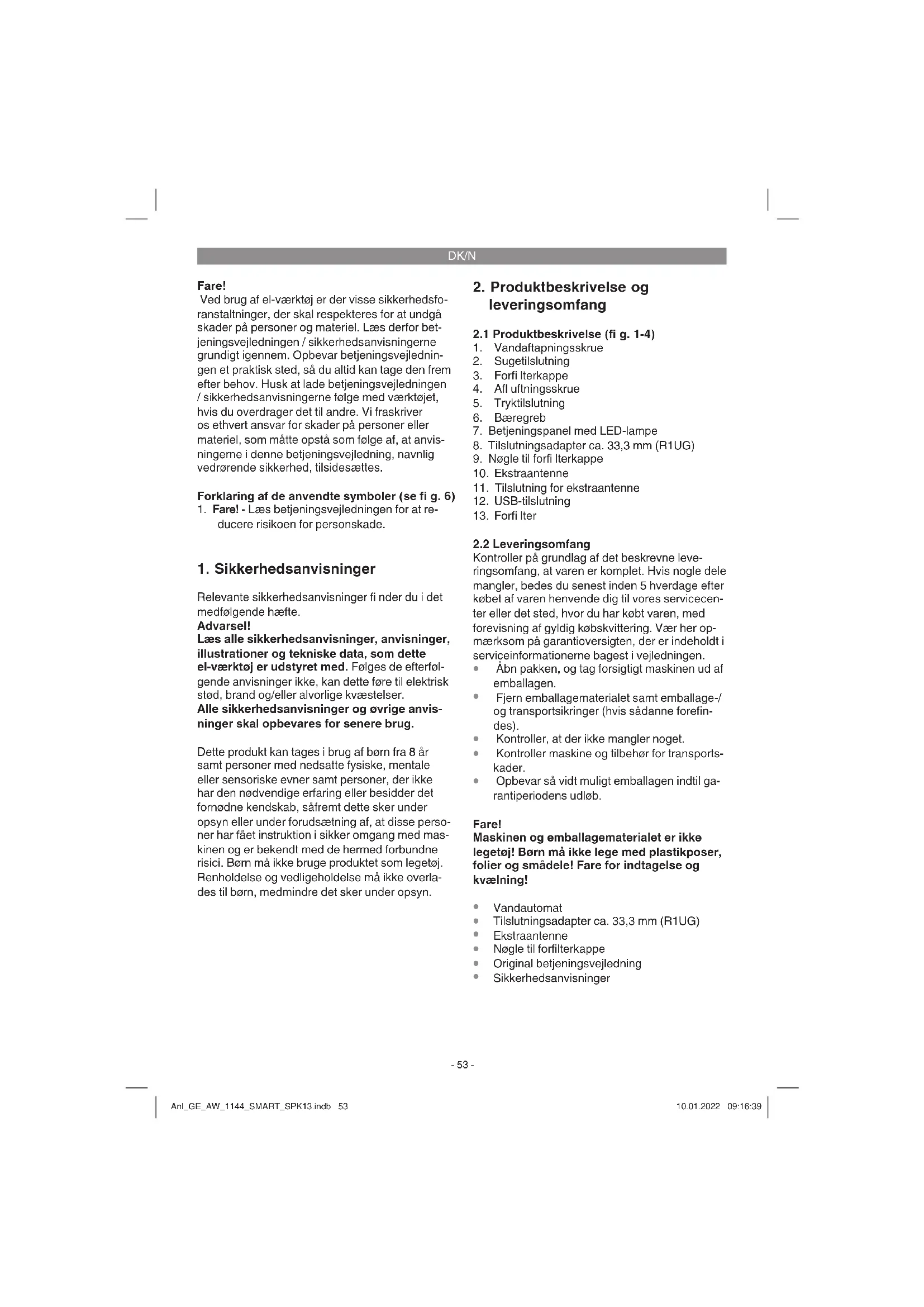 Kun for EU-lande Smid ikke el-værktøj ud som almindeligt husholdningsaff ald! I medfør af Rådets direktiv 2012/19/EF om aff ald af elektrisk og elektronisk udstyr og dettes omsættelse i den nationale lovgivning skal brugt el-værktøj indsamles separat og indleveres til videreanvendende formål på miljømæssig forsvarlig vis. Recycling-alternativ til tilbagesendelse: Ejeren af el-værktøjet er – med mindre denne tilbagesender maskinen – forpligtet til at bortskaff e mas- kinen og dens dele ifølge miljøforskrifterne. Den brugte maskine kan indleveres hos en genbrugsstation – spørg evt. personalet her, eller forhør dig hos din kommune. Tilbehør og hjælpemidler, som følger med maskinen, og som ikke indeholder elektriske dele, er ikke omfattet af ovenstående. Genoptryk eller anden kopiering af dokumentation og følgedokumenter til produkter, også i uddrag, er kun tilladt med udtrykkelig tilladelse fra Einhell Germany AG. Ret til tekniske ændringer forbeholdes Anl_GE_AW_1144_SMART_SPK13.indb 61Anl_GE_AW_1144_SMART_SPK13.indb 61 10.01.2022 09:16:4110.01.2022 09:16:41DK/N