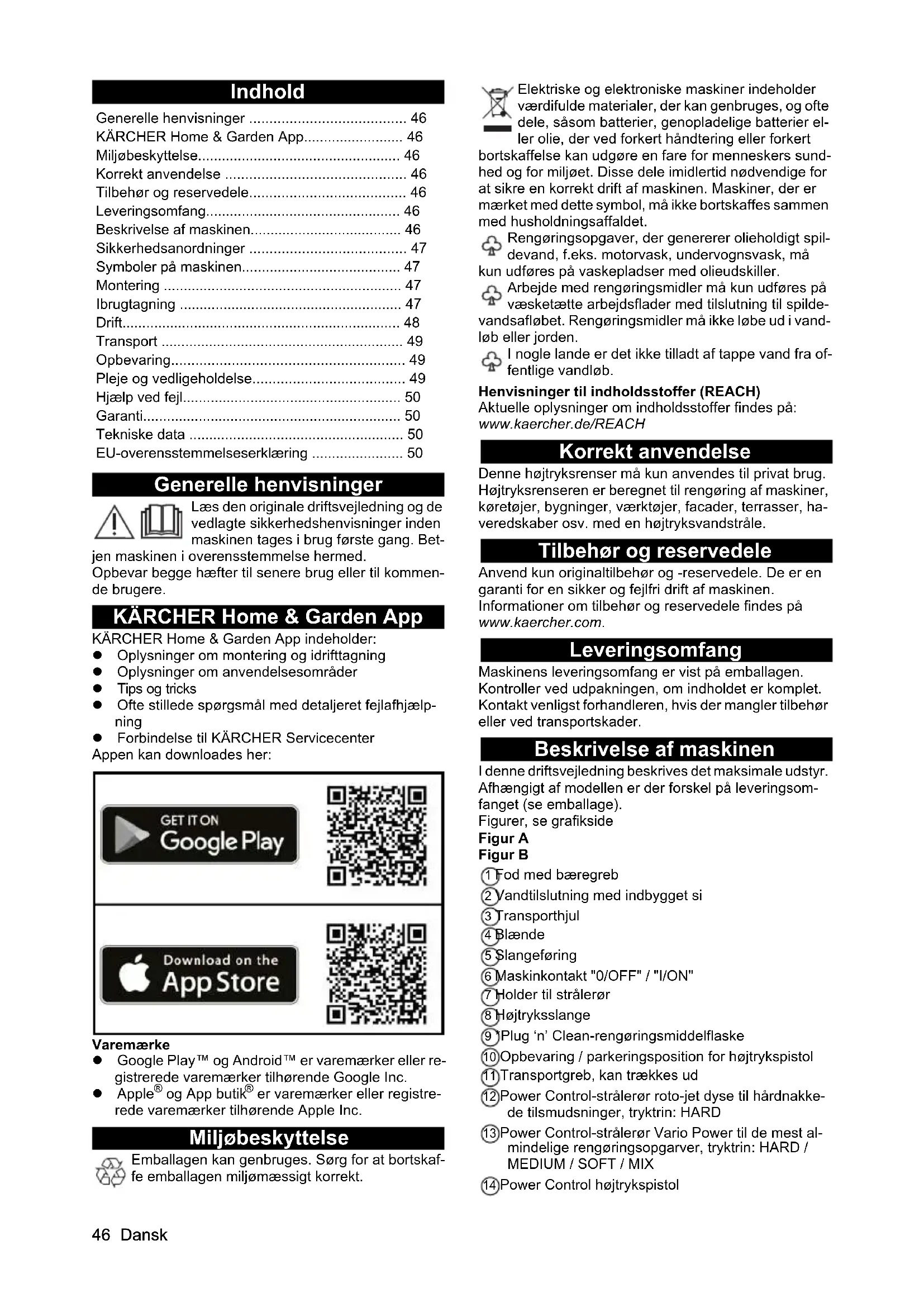 dB(A) 92 92 Chairman of the Board of Management Director Regulatory Affairs & Certification H. Jenner S. Reiser46 Dansk Indhold Generelle henvisninger Læs den originale driftsvejledning og de vedlagte sikkerhedshenvisninger inden maskinen tages i brug første gang. Bet- jen maskinen i overensstemmelse hermed. Opbevar begge hæfter til senere brug eller til kommen- de brugere. KÄRCHER Home & Garden App KÄRCHER Home & Garden App indeholder: Oplysninger om montering og idrifttagning Oplysninger om anvendelsesområder Tips og tricks Ofte stillede spørgsmål med detaljeret fejlafhjælp- ning Forbindelse til KÄRCHER Servicecenter Appen kan downloades her: Varemærke Google Play™ og Android™ er varemærker eller re- gistrerede varemærker tilhørende Google Inc. Apple