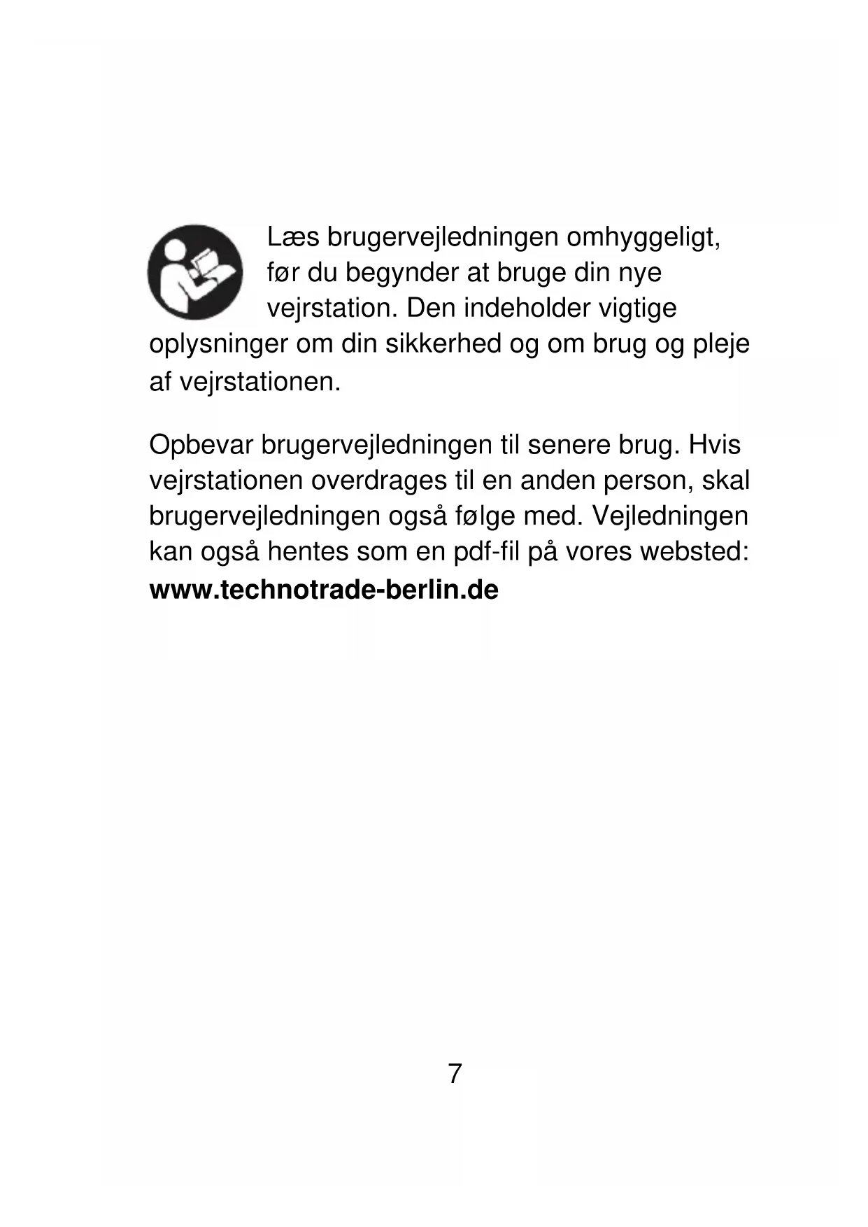 Betjeningsvejledning Instructions d'utilisation Bedienungsanleitung Instruction manual2 Sprog / Langues / Sprachen / Languages Dansk .................................................................. Side 3 Français .......................................................... Page 79 Deutsch .......................................................... Seite 160 English .......................................................... Page 2313 Brugervejledning til vejrstation WD 2000 Indholdsfortegnelse Indledning ............................................................ 8 Din sikkerhed ....................................................... 9 Tilsigtet brug ..................................................... 9 Forklaring af symboler og udtryk .................... 11 Sikkerhedsanvisninger ................................... 12 Ansvarsfraskrivelse ........................................ 15 Beskrivelse af vejrstation/leverede dele ............ 17 Kontrol af leverede dele ................................. 17 Skærm på basestation ................................... 194 Knapper på basestation ................................. 22 Udendørssensor ............................................. 24 Ibrugtagning ....................................................... 25 Download app: ............................................... 26 Registrering af brugere:.................................. 27 Parring med en vejrstation enhed .................. 28 Modtagelse af data ............................................ 34 Modtagelse af udendørsmålinger ................... 34 Symbol for signalstyrke .................................. 36 Betjening ............................................................ 37 Manuel indstilling af tid: .................................. 37 Indstilling af daglige alarmer: ......................... 42 Sådan slår du alarmen fra .............................. 45 Alarmudsættelse: ........................................... 455 Maksimumstemperatur/minimumstemperatur/rel ativ luftfugtighed ............................................. 46 Baggrundslys .................................................. 47 Forklaring af netværksbaseret vejrudsigt ....... 48 Beskrivelse af appgrænseflade: ........................ 54 Visning af data på startskærm: ...................... 54 Visning af datadiagram:.................................. 55 Indstilling af advarsel om temperatur og luftfugtighed .................................................... 59 Advarsel om temperatur og luftfugtighed ....... 62 Beskrivelse af menu ....................................... 62 Visning af lavt batteriniveau ............................... 65 Rengøring .......................................................... 67 Fejlfinding ........................................................... 686 Bortskaffelse ...................................................... 71 Emballage ...................................................... 71 Enhed ............................................................. 71 Batterier .......................................................... 72 Specifikationer ................................................... 73 EU-overensstemmelseserklæring ...................... 74 Service ............................................................... 75 Garantibetingelser .............................................. 76 Garantibevis ....................................................... 787 Læs brugervejledningen omhyggeligt, før du begynder at bruge din nye vejrstation. Den indeholder vigtige oplysninger om din sikkerhed og om brug og pleje af vejrstationen. Opbevar brugervejledningen til senere brug. Hvis vejrstationen overdrages til en anden person, skal brugervejledningen også følge med. Vejledningen kan også hentes som en pdf-fil på vores websted: www.technotrade-berlin.de8 Indledning Du har købt en vejrstation med den innovative DirektWetter teknologi. Udviklet af vejrspecialister som det første i verden medvirker det til, at din vejrstation modtager regionale vejrudsigter udarbejdet af professionelle meteorologer. Derudover sendes den lokale udendørstemperatur til basestationen via en radiosender på frekvensen 868 MHz og på en afstand på op til 50 m. Du får således et omfattende overblik over den aktuelle og kommende vejrsituation. Den seneste teknologi gør vejrstationen meget brugervenlig og kan betjenes med blot nogle få knapper.9 Din sikkerhed Tilsigtet brug Vejrstationen bruges til at vise og udføre funktionerne i brugervejledningen. Vejrstationen består af en modtager (basestation) og en sender. Modtageren og senderes drives af et batteri og kan derfor fungere uafhængigt af en strømforsyning. En smartphone med internetadgang er nødvendig for at bruge stationen med den gratis app. Basestationen må kun bruges et tørt indendørs sted og udendørssenderen kun i beskyttede områder udendørs. Vejrstationen må bruges af børn på 8 år eller derover og personer med reducerede fysiske, sensoriske eller mentale evner, eller som mangler erfaring og viden, hvis de er under opsyn eller har10 modtaget instruktion i sikker brug af vejrstationen og forstår de involverede farer. Børn må ikke lege med vejrstationen. Vejrstationen er kun beregnet til hjemmebrug og ikke til erhvervsbrug. Vejrstationen må ikke bruges til medicinske formål eller til at levere oplysninger til offentligheden. Brug kun vejrstationen til det tiltænkte formål. Vejrstationen må ikke modificeres eller teknikken ændres.11 Forklaring af symboler og udtryk ADVARSEL Signalordet/konet betegner en fare med en mellemhøj risiko, som kan medføre død eller alvorlig personskade, hvis den ikke undgås. FORSIGTIG Signalordet/ikonet betegner en fare med en lav risiko, som kan medføre mindre eller moderat personskade, hvis den ikke undgås.12 Sikkerhedsanvisninger ADVARSEL Kvælningsfare! Børn kan blive fanget i emballagefilmen og putte små dele i munden. Lad ikke børn lege med emballagen. Hold b