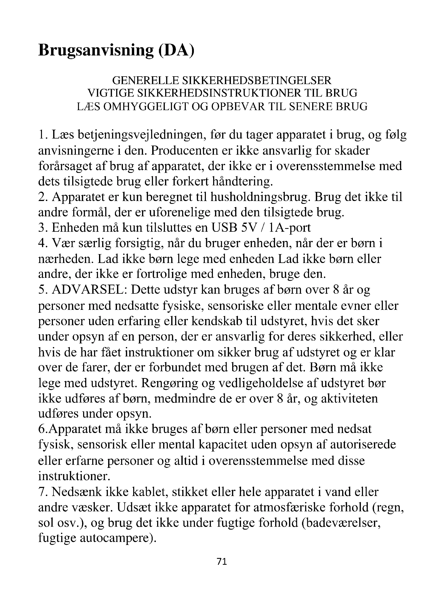personer med nedsatte fysiske, sensoriske eller mentale evner eller personer uden erfaring eller kendskab til udstyret, hvis det sker under opsyn af en person, der er ansvarlig for deres sikkerhed, eller hvis de har fået instruktioner om sikker brug af udstyret og er klar over de farer, der er forbundet med brugen af det. Børn må ikke lege med udstyret. Rengøring og vedligeholdelse af udstyret bør ikke udføres af børn, medmindre de er over 8 år, og aktiviteten udføres under opsyn. 6.Apparatet må ikke bruges af børn eller personer med nedsat fysisk, sensorisk eller mental kapacitet uden opsyn af autoriserede eller erfarne personer og altid i overensstemmelse med disse instruktioner.