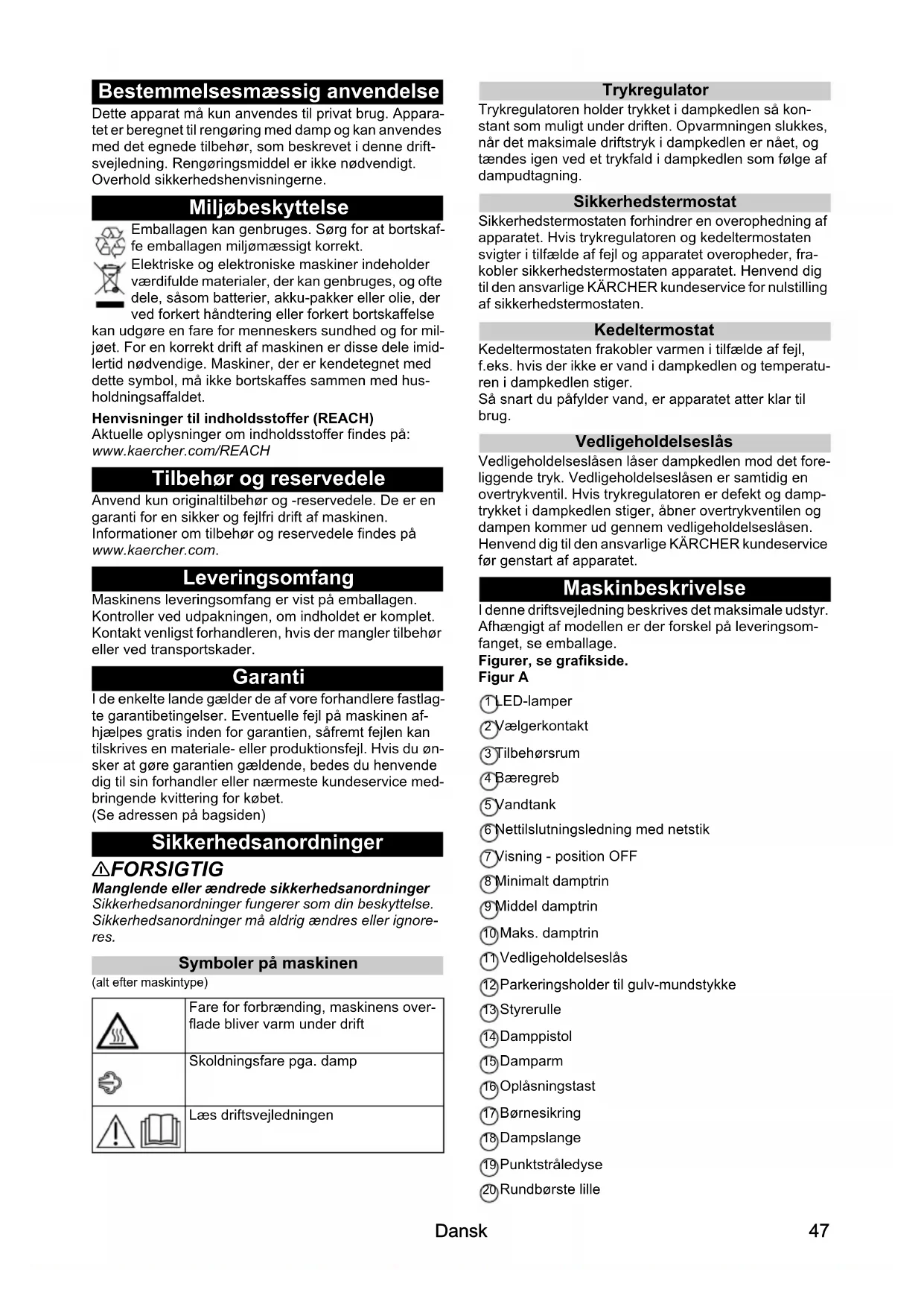 - Tekniske data Dansk Bestemmelsesmæssig anvendelse Dette apparat må kun anvendes til privat brug. Appara- tet er beregnet til rengøring med damp og kan anvendes med det egnede tilbehør, som beskrevet i denne drift- svejledning. Rengøringsmiddel er ikke nødvendigt. Overhold sikkerhedshenvisningerne. Miljøbeskyttelse Emballagen kan genbruges. Sørg for at bortskaf- fe emballagen miljømæssigt korrekt. Elektriske og elektroniske maskiner indeholder værdifulde materialer, der kan genbruges, og ofte dele, såsom batterier, akku-pakker eller olie, der ved forkert håndtering eller forkert bortskaffelse kan udgøre en fare for menneskers sundhed og for mil- jøet. For en korrekt drift af maskinen er disse dele imid- lertid nødvendige. Maskiner, der er kendetegnet med dette symbol, må ikke bortskaffes sammen med hus- holdningsaffaldet. Henvisninger til indholdsstoffer (REACH) Aktuelle oplysninger om indholdsstoffer findes på: www.kaercher.com/REACH Tilbehør og reservedele Anvend kun originaltilbehør og -reservedele. De er en garanti for en sikker og fejlfri drift af maskinen. Informationer om tilbehør og reservedele findes på www.kaercher.com. Leveringsomfang Maskinens leveringsomfang er vist på emballagen. Kontroller ved udpakningen, om indholdet er komplet. Kontakt venligst forhandleren, hvis der mangler tilbehør eller ved transportskader. Garanti I de enkelte lande gælder de af vore forhandlere fastlag- te garantibetingelser. Eventuelle fejl på maskinen af- hjælpes gratis inden for garantien, såfremt fejlen kan tilskrives en materiale- eller produktionsfejl. Hvis du øn- sker at gøre garantien gældende, bedes du henvende dig til sin forhandler eller nærmeste kundeservice med- bringende kvittering for købet. (Se adressen på bagsiden) Sikkerhedsanordninger 몇 FORSIGTIG Manglende eller ændrede sikkerhedsanordninger Sikkerhedsanordninger fungerer som din beskyttelse. Sikkerhedsanordninger må aldrig ændres eller ignore- res. Symboler på maskinen (alt efter maskintype) Trykregulator Trykregulatoren holder trykket i dampkedlen så kon- stant som muligt under driften. Opvarmningen slukkes, når det maksimale driftstryk i dampkedlen er nået, og tændes igen ved et trykfald i dampkedlen som følge af dampudtagning. Sikkerhedstermostat Sikkerhedstermostaten forhindrer en overophedning af apparatet. Hvis trykregulatoren og kedeltermostaten svigter i tilfælde af fejl og apparatet overopheder, fra- kobler sikkerhedstermostaten apparatet. Henvend dig til den ansvarlige KÄRCHER kundeservice for nulstilling af sikkerhedstermostaten. Kedeltermostat Kedeltermostaten frakobler varmen i tilfælde af fejl, f.eks. hvis der ikke er vand i dampkedlen og temperatu- ren i dampkedlen stiger. Så snart du påfylder vand, er apparatet atter klar til brug. Vedligeholdelseslås Vedligeholdelseslåsen låser dampkedlen mod det fore- liggende tryk. Vedligeholdelseslåsen er samtidig en overtrykventil. Hvis trykregulatoren er defekt og damp- trykket i dampkedlen stiger, åbner overtrykventilen og dampen kommer ud gennem vedligeholdelseslåsen. Henvend dig til den ansvarlige KÄRCHER kundeservice før genstart af apparatet. Maskinbeskrivelse I denne driftsvejledning beskrives det maksimale udstyr. Afhængigt af modellen er der forskel på leveringsom- fanget, se emballage. Figurer, se grafikside. Figur A 1 LED-lamper 2 Vælgerkontakt 3 Tilbehørsrum 4 Bæregreb 5 Vandtank 6 Nettilslutningsledning med netstik 7 Visning - position OFF 8 Minimalt damptrin 9 Middel damptrin 10 Maks. damptrin 11 Vedligeholdelseslås 12 Parkeringsholder til gulv-mundstykke 13 Styrerulle 14 Damppistol 15 Damparm 16 Oplåsningstast 17 Børnesikring 18 Dampslange 19 Punktstråledyse 20 Rundbørste lille Fare for forbrænding, maskinens over- flade bliver varm under drift Skoldningsfare pga. damp Læs driftsvejledningenDansk p. 5147
