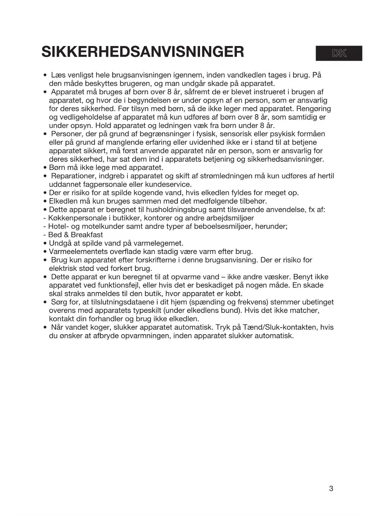 - Læs venligst hele brugsanvisningen igennem, inden vandkedlen tages i brug. På den måde beskyttes brugeren, og man undgår skade på apparatet.