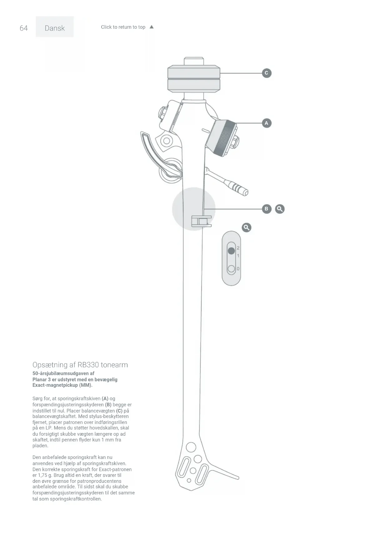 Opsætning af RB330 tonearm 50-årsjubilæumsudgaven af Planar 3 er udstyret med en bevægelig Exact-magnetpickup (MM). Sørg for, at sporingskraftskiven (A) og forspændingsjusteringsskyderen (B) begge er indstillet til nul. Placer balancevægten (C) på balancevægtskaftet. Med stylus-beskytteren fjernet, placer patronen over indføringsrillen på en LP. Mens du støtter hovedskallen, skal du forsigtigt skubbe vægten længere op ad skaftet, indtil pennen yder kun 1 mm fra pladen. Den anbefalede sporingskraft kan nu anvendes ved hjælp af sporingskraftskiven. Den korrekte sporingskraft for Exact-patronen er 1,75 g. Brug altid en kraft, der svarer til den øvre grænse for patronproducentens anbefalede område. Til sidst skal du skubbe forspændingsjusteringsskyderen til det samme tal som sporingskraftkontrollen. Dansk Click to return to top65 Hastighedsjustering (fabriksindstillet – juster kun om nødvendigt) Bemærk venligst: Hastigheden er fabriksindstillet, og vi anbefaler ikke justering, medmindre der serviceres eller skiftes drivremmen.
