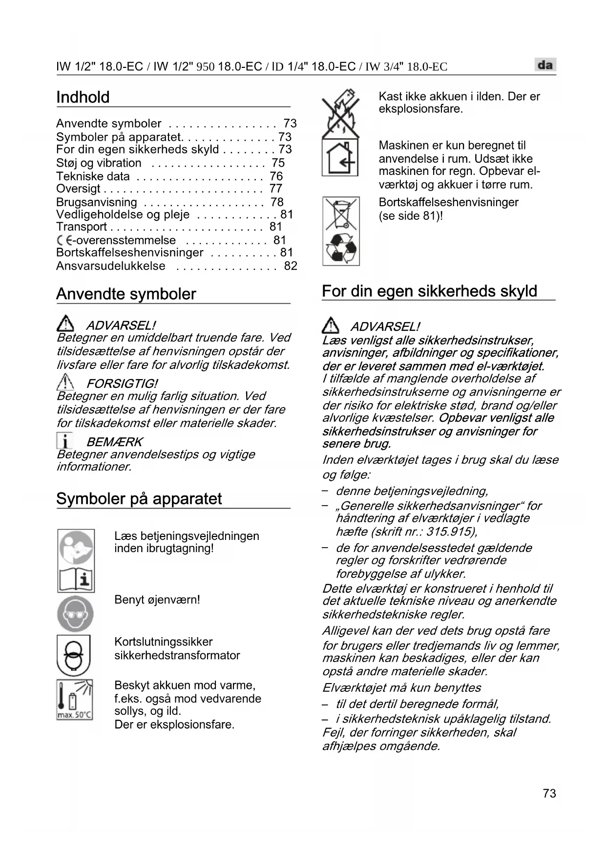 ADVARSEL! Akkumulatorer/batterier er ikke normalt affald og må derfor ikke destrueres sammen med normalt husholdningsaffald, brændes eller kastes i vand. Udtjente akkumulatorer må ikke åbnes. Akkuer/batterier skal indsamles og genbruges eller bortskaffes på en miljøvenlig måde. Kun for EU-lande. I henhold til europæisk direktiv 2006/66/EF skal defekte eller udtjente akkumulatorer/ batterier indsamles separat og afleveres på et indsamlingssted for materialegenvinding. BEMÆRK Forhandleren giver oplysninger om bortskaffelsesmuligheder. Ansvarsudelukkelse Fabrikanten og hans repræsentant hæfter ikke for skader og fortjeneste som virksomheden evt. er gået glip af som følge af driftsafbrydelse i virksomheden, forårsaget af produktet eller fordi produktet ikke kunne benyttes. Fabrikanten og dennes repræsentant hæfter ikke for skader opstået som følge af usagkyndig anvendelse eller i forbindelse med produkter fra andre fabrikanter.IW 1/2" 18.0-EC / IW 1/2" 950 18.0-EC / ID 1/4" 18.0-EC / IW 3/4" 18.0-EC