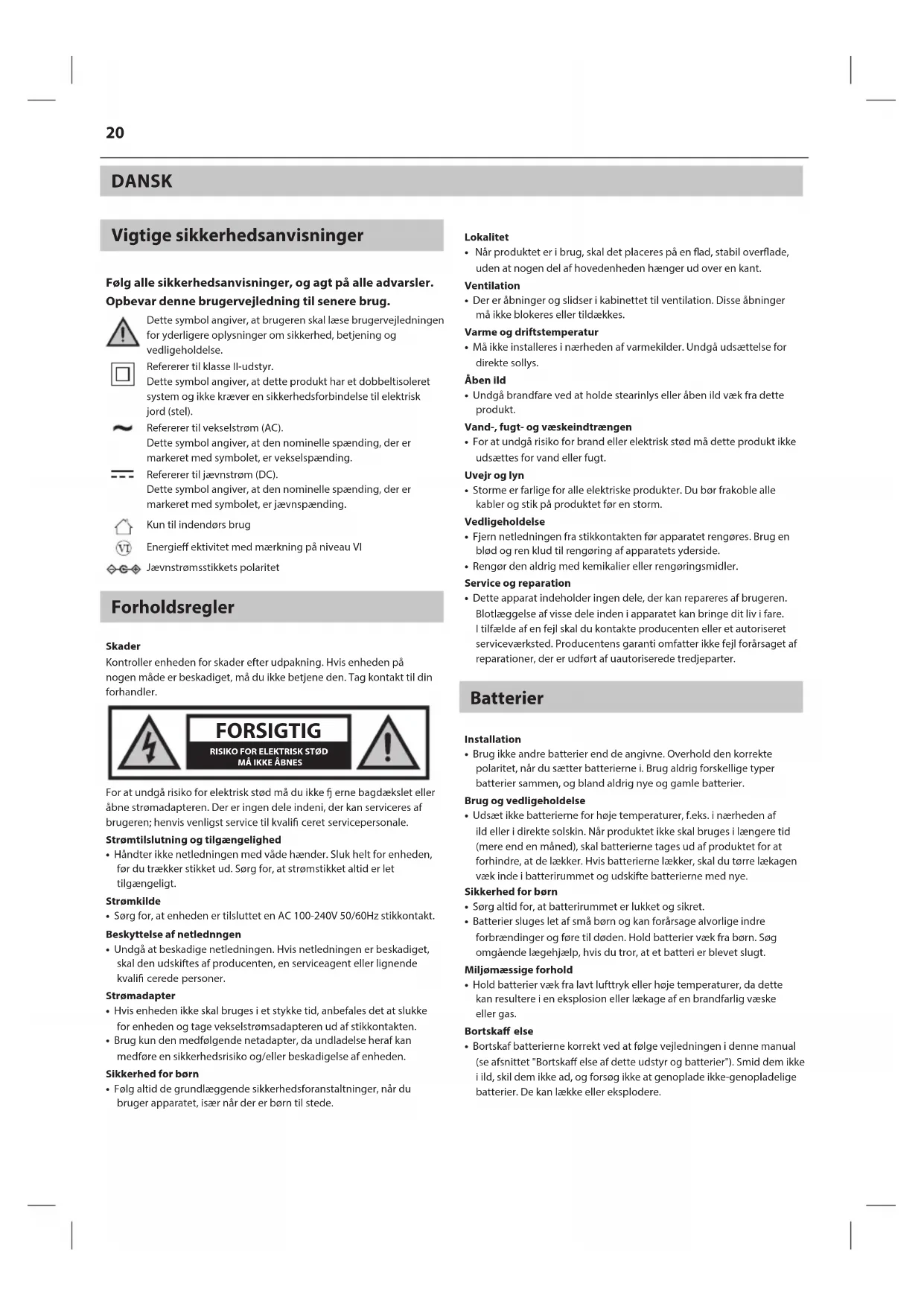 - Dette apparat indeholder ingen dele, der kan repareres af brugeren. Blotlæggelse af visse dele inden i apparatet kan bringe dit liv i fare. I tilfælde af en fejl skal du kontakte producenten eller et autoriseret serviceværksted. Producentens garanti omfatter ikke fejl forårsaget af reparationer, der er udført af uautoriserede tredjeparter. Batterier Installation