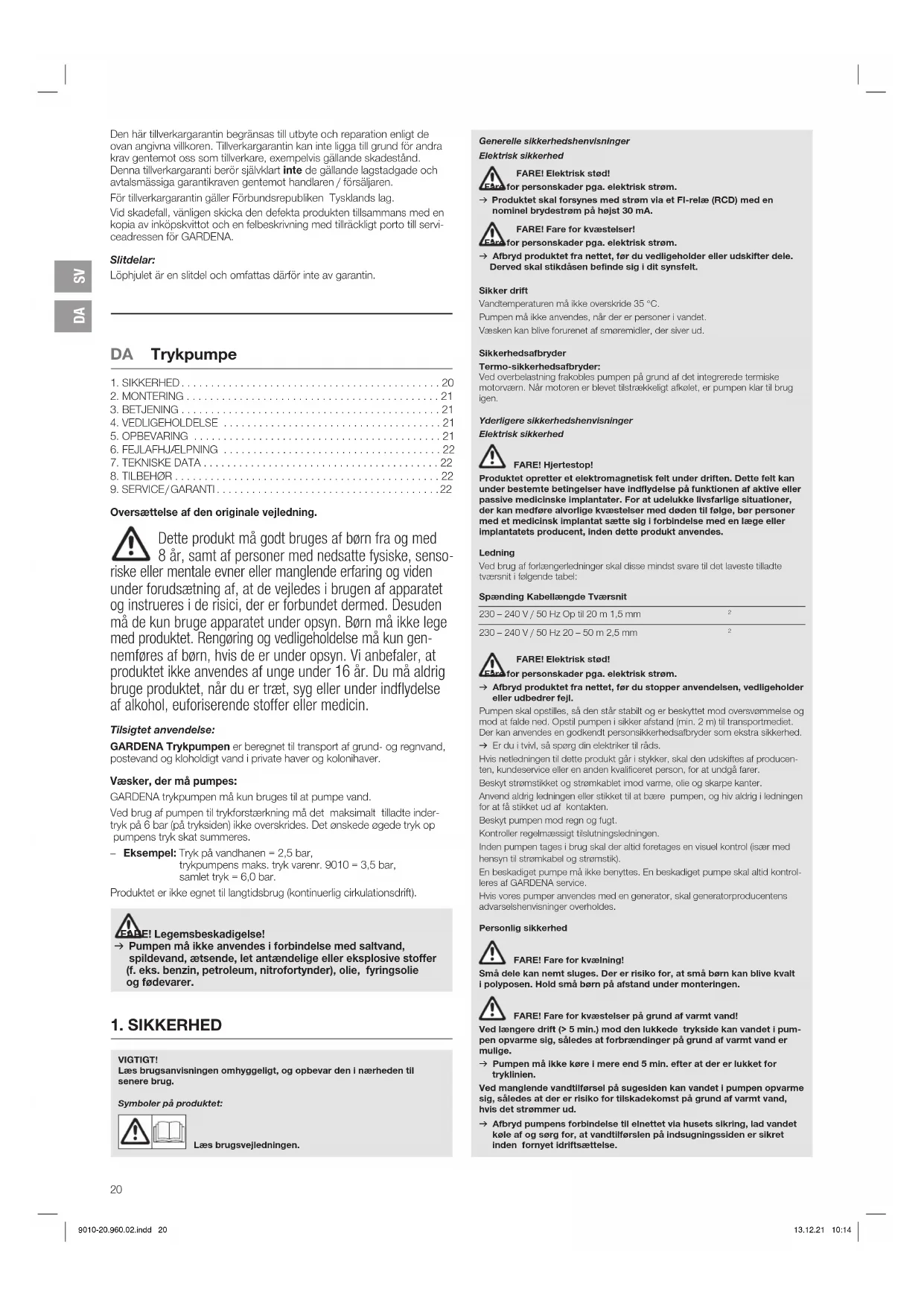 Oversættelse af den originale vejledning. Dette produkt må godt bruges af børn fra og med 8år, samt af personer med nedsatte fysiske, senso- riske eller mentale evner eller manglende erfaring og viden under forudsætning af, at de vejledes i brugen af apparatet og instrueres i de risici, der er forbundet dermed. Desuden må de kun bruge apparatet under opsyn. Børn må ikke lege med produktet. Rengøring og vedligeholdelse må kun gen- nemføres af børn, hvis de er under opsyn. Vi anbefaler, at produktet ikke anvendes af unge under 16 år. Du må aldrig bruge produktet, når du er træt, syg eller under indflydelse afalkohol, euforiserende stoffer eller medicin. Tilsigtet anvendelse: GARDENA Trykpumpen er beregnet til transport af grund- og regnvand, postevand og kloholdigt vand i private haver og kolonihaver. Væsker, der må pumpes: GARDENA trykpumpen må kun bruges til at pumpe vand. Ved brug af pumpen til trykforstærkning må det maksimalt tilladte inder- trykpå 6 bar (på tryksiden) ikke overskrides. Det ønskede øgede tryk op pumpens tryk skat summeres. – Eksempel: Tryk på vandhanen = 2,5 bar, trykpumpens maks. tryk varenr. 9010 = 3,5 bar, samlet tryk = 6,0 bar. Produktet er ikke egnet til langtidsbrug (kontinuerlig cirkulationsdrift). FARE! Legemsbeskadigelse! v Pumpen må ikke anvendes i forbindelse med saltvand, spildevand, ætsende, let antændelige eller eksplosive stoffer (f. eks. benzin, petroleum, nitrofortynder), olie, fyringsolie ogfødevarer. Generelle sikkerhedshenvisninger Elektrisk sikkerhed FARE! Elektrisk stød! Fare for personskader pga. elektrisk strøm. v Produktet skal forsynes med strøm via et FI-relæ (RCD) med en nominel brydestrøm på højst 30 mA. FARE! Fare for kvæstelser! Fare for personskader pga. elektrisk strøm. v Afbryd produktet fra nettet, før du vedligeholder eller udskifter dele. Derved skal stikdåsen befinde sig i dit synsfelt. Sikker drift Vandtemperaturen må ikke overskride 35 °C. Pumpen må ikke anvendes, når der er personer i vandet. Væsken kan blive forurenet af smøremidler, der siver ud. Sikkerhedsafbryder Termo-sikkerhedsafbryder: Ved overbelastning frakobles pumpen på grund af det integrerede termiske motorværn. Når motoren er blevet tilstrækkeligt afkølet, er pumpen klar til brug igen. Yderligere sikkerhedshenvisninger Elektrisk sikkerhed FARE! Hjertestop! Produktet opretter et elektromagnetisk felt under driften. Dette felt kan under bestemte betingelser have indflydelse på funktionen af aktive eller passive medicinske implantater. For at udelukke livsfarlige situationer, der kan medføre alvorlige kvæstelser med døden til følge, bør personer med et medicinsk implantat sætte sig i forbindelse med en læge eller implantatets producent, inden dette produkt anvendes. Ledning Ved brug af forlængerledninger skal disse mindst svare til det laveste tilladte tværsnit i følgende tabel: Spænding Kabellængde Tværsnit 230 – 240 V / 50 Hz Op til 20 m 1,5 mm
