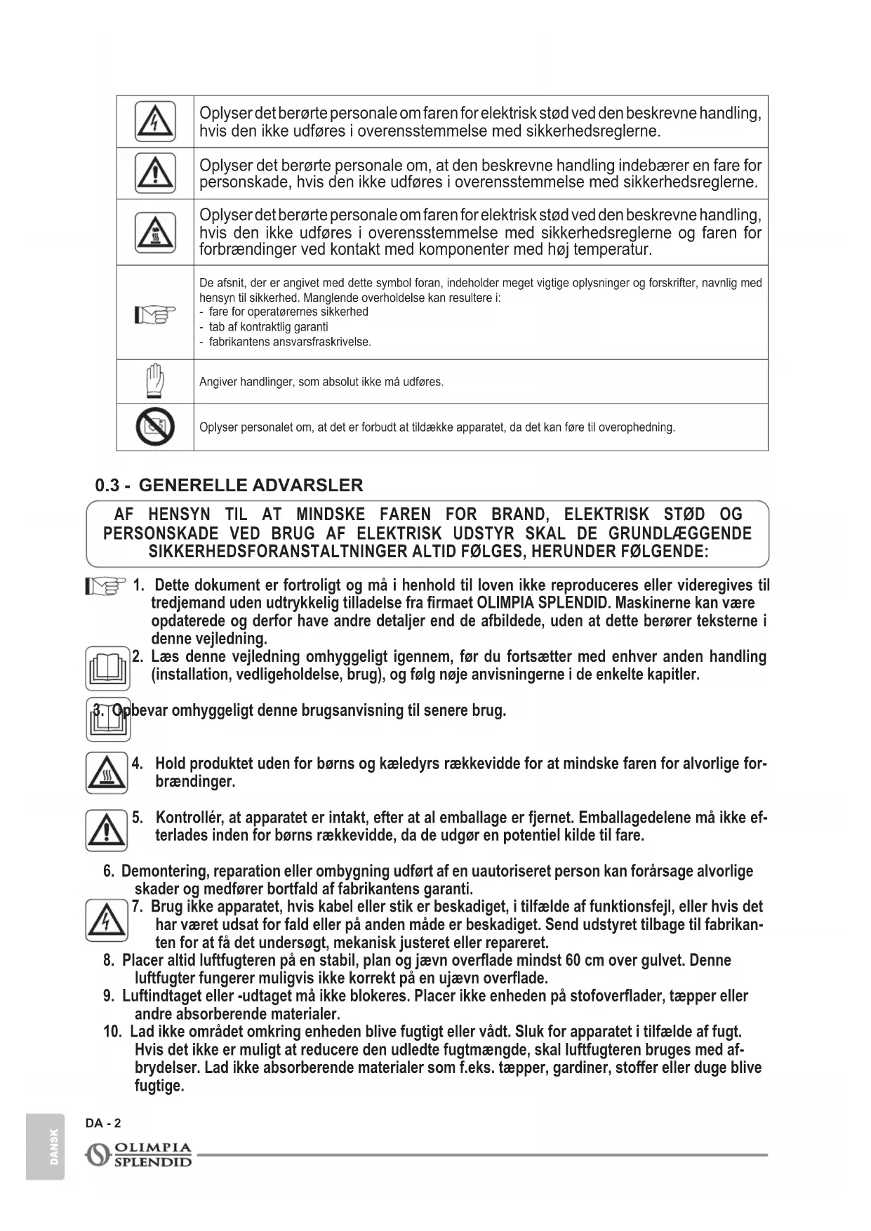 Oplyser det berørte personale om faren for elektrisk stød ved den beskrevne handling, hvis den ikke udføres i overensstemmelse med sikkerhedsreglerne og faren for forbrændinger ved kontakt med komponenter med høj temperatur. De afsnit, der er angivet med dette symbol foran, indeholder meget vigtige oplysninger og forskrifter, navnlig med hensyn til sikkerhed. Manglende overholdelse kan resultere i:- fare for operatørernes sikkerhed- tab af kontraktlig garanti- fabrikantens ansvarsfraskrivelse.Angiver handlinger, som absolut ikke må udføres.Oplyser personalet om, at det er forbudt at tildække apparatet, da det kan føre til overophedning. AF HENSYN TIL AT MINDSKE FAREN FOR BRAND, ELEKTRISK STØD OG PERSONSKADE VED BRUG AF ELEKTRISK UDSTYR SKAL DE GRUNDLÆGGENDE SIKKERHEDSFORANSTALTNINGER ALTID FØLGES, HERUNDER FØLGENDE:LIMPIA HERO