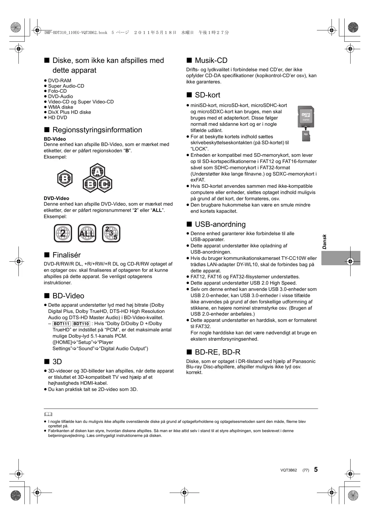 ∫ Finalisér DVD-R/RW/R DL, +R/+RW/+R DL og CD-R/RW optaget af en optager osv. skal finaliseres af optageren for at kunne afspilles på dette apparat. Se venligst optagerens instruktioner. ∫ BD-Video ≥ Dette apparat understøtter lyd med høj bitrate (Dolby Digital Plus, Dolby TrueHD, DTS-HD High Resolution Audio og DTS-HD Master Audio) i BD-Video-kvalitet. – [BDT111] [BDT110] : Hvis “Dolby D/Dolby D +/Dolby TrueHD” er indstillet på “PCM”, er det maksimale antal mulige Dolby-lyd 5.1-kanals PCM. ([HOME]>“Setup”>“Player Settings”>“Sound”>“Digital Audio Output”) ∫ 3D ≥ 3D-videoer og 3D-billeder kan afspilles, når dette apparat er tilsluttet et 3D-kompatibelt TV ved hjælp af et højhastigheds HDMI-kabel. ≥ Du kan praktisk talt se 2D-video som 3D. ≥ Denne enhed garanterer ikke forbindelse til alle USB-apparater. ≥ Dette apparat understøtter ikke opladning af USB-anordningen. ≥ Hvis du bruger kommunikationskameraet TY-CC10W eller trådløs LAN-adapter DY-WL10, skal de forbindes bag på dette apparat. ≥ FAT12, FAT16 og FAT32-filsystemer understøttes. ≥ Dette apparat understøtter USB 2.0 High Speed. ≥ Selv om denne enhed kan anvende USB 3.0-enheder som USB 2.0-enheder, kan USB 3.0-enheder i visse tilfælde ikke anvendes på grund af den forskellige udformning af stikkene, en højere nominel strømstyrke osv. (Brugen af USB 2.0-enheder anbefales.) ≥ Dette apparat understøtter en harddisk, som er formateret til FAT32. For nogle harddiske kan det være nødvendigt at bruge en ekstern strømforsyningsenhed. ∫ BD-RE, BD-R Diske, som er optaget i DR-tilstand ved hjælp af Panasonic Blu-ray Disc-afspillere, afspiller muligvis ikke lyd osv. korrekt. ≥ I nogle tilfælde kan du muligvis ikke afspille ovenstående diske på grund af optageforholdene og optagelsesmetoden samt den måde, filerne blev oprettet på. ≥ Fabrikanten af disken kan styre, hvordan diskene afspilles. Så man er ikke altid selv i stand til at styre afspilningen, som beskrevet i denne betjeningsvejledning. Læs omhygeligt instruktionerne på disken. VQT3B62 (77)