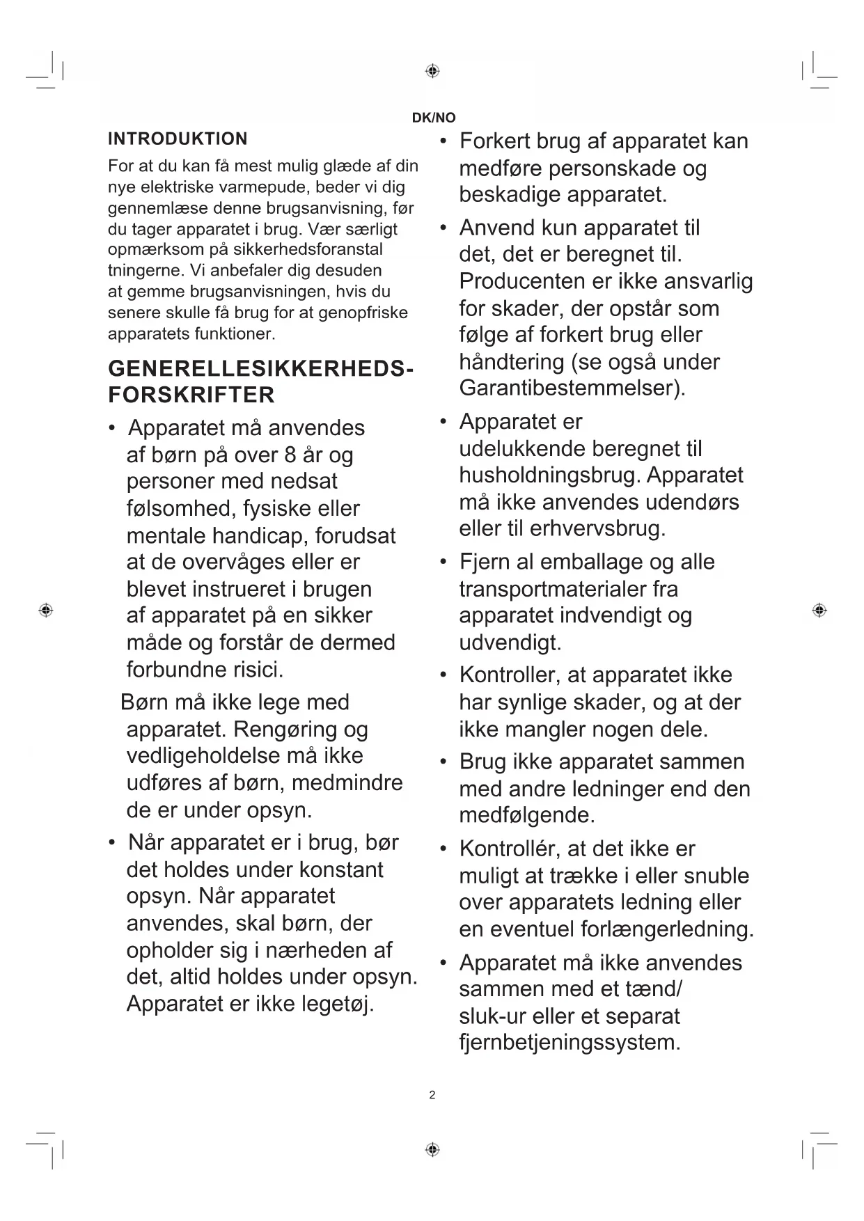 - Apparatet skal være foldet helt ud under brug. Der må ikke stikkes sikkerhedsnåle eller lignende gennem apparatet.4 DK/NO