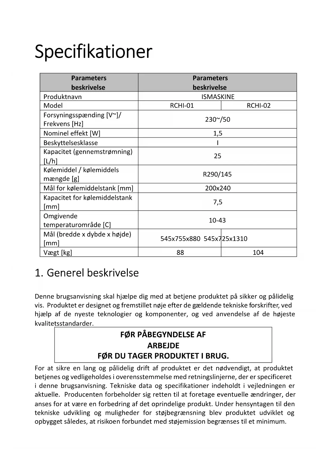 Betegnelsen ”maskine” eller ”produkt” i det efterfølgende henviser til ISMASKINE.2.1. Elektrisk sikkerhed a) Stikket på produktet skal passe til stikkontakten. Enhver form for modifikationer af stikket er forbudt. De originale stik og egnede kontakter mindsker risikoen for elektrisk stød. b) Undgå berøring af jordede overflader, såsom rør, radiatorer, komfurer og køleskabe. Der er en større risiko for elektrisk stød, hvis kroppen er jordet og rører ved udstyr, der er udsat for direkte påvirkning af regn, våd belægning og drift i fugtigt miljø. Indtrængning af vand i udstyret øger risikoen for beskadigelse heraf og elektrisk stød. c) Brug ikke ledningen på en ukorrekt måde. Brug aldrig ledningen til at bære det elektriske værktøj eller til at trække stikket ud af kontakten. Hold ledningen væk fra varmekilder, olie, skarpe kanter og bevægelige dele. Defekte elle snoede ledninger øger risikoen for elektrisk stød. d) Kan brug af udstyret i fugtigt miljø ikke undgås skal der anvendes en fejlstrømsafbryder (RCD). Brug af en RCD mindsker risikoen for elektrisk stød. e) Det er ikke tilladt at bruge ledninger der er beskadigede eller viser tegn på slitage. En autoriseret elektriker eller servicetekniker skal udskifte den beskadigede ledning f) For at undgå elektrisk stød må man ikke nedsænke kablet, stikket eller selve produktet i vand eller anden væske. Produktet må ikke bruges på våde overflader. 2.2. Arbejdspladssikkerhed a) Hold arbejdsområdet ryddeligt og godt belyst. Uorden eller dårlig belysning kan føre til ulykker. Ved brug af denne maskine, skal du være fremadrettet og bruge din sunde fornuft. Du skal også altid være opmærksom på hvad du laver. b) Når det konstateres, at maskinen er defekt eller beskadiget, må den straks tages ud af brug og den ansvarlige person kontaktes. c) Hvis du er i tvivl om, hvorvidt produktet fungerer korrekt, kontakt producentens serviceafdeling. d) Reparationer på produktet må kun udføres af en autoriseret servicetekniker. Du må ikke foretage reparationer selv! e) Hvis maskinen er strømført og der opstår brand må der kun bruges tørt pulver eller kuldioxid (CO2) ildslukkere til at slukke maskinen. f) Ophold af børn og uautoriserede personer på arbejdspladsen, forbudt. g) Kontroller regelmæssigt, at sikkerhedsmærkaterne er i god stand. Sikkerhedsmærkaterne skal udskiftes, hvis de ikke er læselige. h) Brugsvejledningen skal gemmes til fremtidig brug. Hvis produktet videregives til tredjemand, skal brugsvejledningen medfølge.