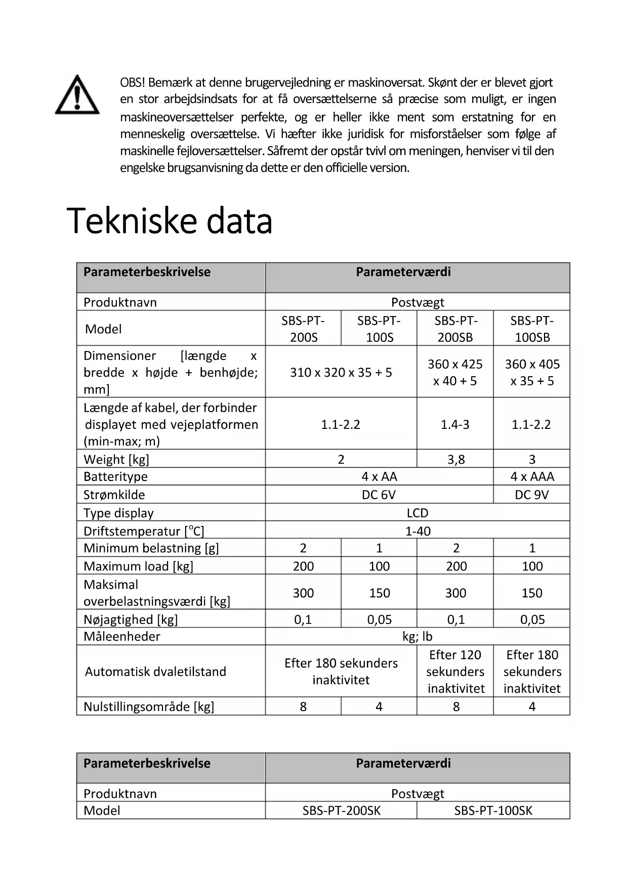 Parameterbeskrivelse Parameterværdi Produktnavn Postvægt Model SBS-PT-200SK SBS-PT-100SK OBS! Bemærk at denne brugervejledning er maskinoversat. Skønt der er blevet gjort en stor arbejdsindsats for at få oversættelserne så præcise som muligt, er ingen maskineoversættelser perfekte, og er heller ikke ment som erstatning for en menneskelig oversættelse. Vi hæfter ikke juridisk for misforståelser som følge af maskinelle fejloversættelser. Såfremt der opstår tvivl om meningen, henviser vi til den engelske brugsanvisning da dette er den officielle version.Dimensioner [bredde x dybde x højde; mm] 360 x 405 x 65 Displaymål [mm] 135 x 65 Weight [kg] 3,5 Batteritype 4 x AA Strømkilde DC 6V Type display LCD Driftstemperatur [