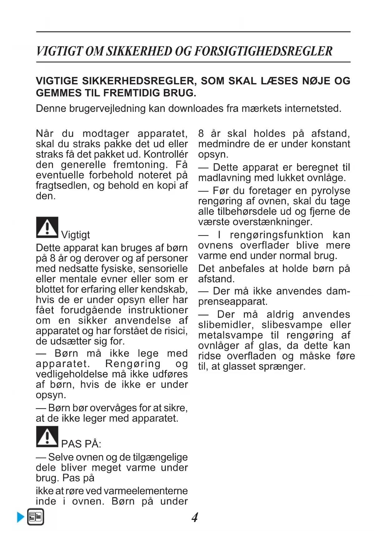 Når du modtager apparatet, skal du straks pakke det ud eller straks få det pakket ud. Kontrollér den generelle fremtoning. Få eventuelle forbehold noteret på fragtsedlen, og behold en kopi af den. Vigtigt Dette apparat kan bruges af børn på 8 år og derover og af personer med nedsatte fysiske, sensorielle eller mentale evner eller som er blottet for erfaring eller kendskab, hvis de er under opsyn eller har fået forudgående instruktioner om en sikker anvendelse af apparatet og har forstået de risici, de udsætter sig for. — Børn må ikke lege med apparatet. Rengøring og vedligeholdelse må ikke udføres af børn, hvis de ikke er under opsyn. — Børn bør overvåges for at sikre, at de ikke leger med apparatet. PAS PÅ: — Selve ovnen og de tilgængelige dele bliver meget varme under brug. Pas på ikke at røre ved varmeelementerne inde i ovnen. Børn på under 8 år skal holdes på afstand, medmindre de er under konstant opsyn. — Dette apparat er beregnet til madlavning med lukket ovnlåge. — Før du foretager en pyrolyse rengøring af ovnen, skal du tage alle tilbehørsdele ud og fjerne de værste overstænkninger. — I rengøringsfunktion kan ovnens overflader blive mere varme end under normal brug. Det anbefales at holde børn på afstand. — Der må ikke anvendes dam- prenseapparat. — Der må aldrig anvendes slibemidler, slibesvampe eller metalsvampe til rengøring af ovnlåger af glas, da dette kan ridse overaden og måske føre til, at glasset sprænger. VIGTIGE SIKKERHEDSREGLER, SOM SKAL LÆSES NØJE OG GEMMES TIL FREMTIDIG BRUG. Denne brugervejledning kan downloades fra mærkets internetsted.5