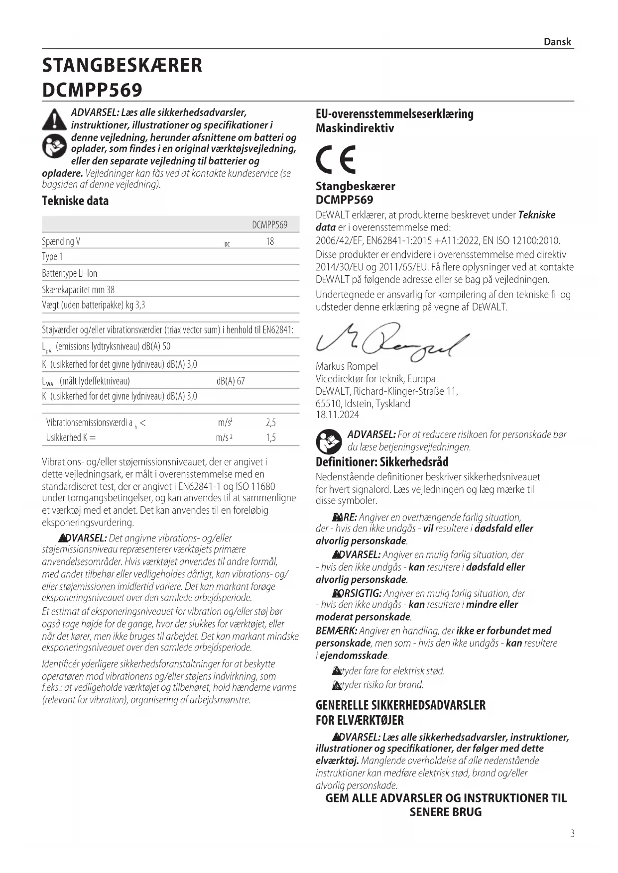 ADVARSEL: Læs alle sikkerhedsadvarsler, instruktioner, illustrationer og specifikationer, der følger med dette elværktøj. Manglende overholdelse af alle nedenstående instruktioner kan medføre elektrisk stød, brand og/eller alvorligpersonskade.GEM ALLE ADVARSLER OG INSTRUKTIONER TIL SENERE BRUG ADVARSEL: For at reducere risikoen for personskade bør du læsebetjeningsvejledningen. Definitioner: Sikkerhedsråd Nedenstående definitioner beskriver sikkerhedsniveauet for hvert signalord. Læs vejledningen og læg mærke til dissesymboler. FARE: Angiver en overhængende farlig situation, der - hvis den ikke undgås - vil resultere i dødsfald eller alvorligpersonskade. ADVARSEL: Angiver en mulig farlig situation, der - hvis den ikke undgås - kan resultere i dødsfald eller alvorligpersonskade. FORSIGTIG: Angiver en mulig farlig situation, der - hvis den ikke undgås - kan resultere i mindre eller moderatpersonskade. BEMÆRK: Angiver en handling, der ikke er forbundet med personskade, men som - hvis den ikke undgås - kan resultere iejendomsskade. Betyder fare for elektriskstød. Betyder risiko forbrand. EU‑overensstemmelseserklæring Maskindirektiv Stangbeskærer DCMPP569 DeWALT erklærer, at produkterne beskrevet under Tekniske data er i overensstemmelse med: 2006/42/EF, EN62841-1:2015 +A11:2022, EN ISO 12100:2010.Disse produkter er endvidere i overensstemmelse med direktiv 2014/30/EU og 2011/65/EU. Få flere oplysninger ved at kontakte DeWALT på følgende adresse eller se bag på vejledningen.Undertegnede er ansvarlig for kompilering af den tekniske fil og udsteder denne erklæring på vegne afDeWALT.Markus Rompel Vicedirektør for teknik, Europa DeWALT, Richard-Klinger-Straße 11, 65510, Idstein, Tyskland 18.11.2024Vibrations- og/eller støjemissionsniveauet, der er angivet i dette vejledningsark, er målt i overensstemmelse med en standardiseret test, der er angivet i EN62841-1 og ISO 11680 under tomgangsbetingelser, og kan anvendes til at sammenligne et værktøj med et andet. Det kan anvendes til en foreløbig eksponeringsvurdering. ADVARSEL: Det angivne vibrations- og/eller støjemissionsniveau repræsenterer værktøjets primære anvendelsesområder. Hvis værktøjet anvendes til andre formål, med andet tilbehør eller vedligeholdes dårligt, kan vibrations- og/eller støjemissionen imidlertid variere. Det kan markant forøge eksponeringsniveauet over den samlede arbejdsperiode.Et estimat af eksponeringsniveauet for vibration og/eller støj bør også tage højde for de gange, hvor der slukkes for værktøjet, eller når det kører, men ikke bruges til arbejdet. Det kan markant mindske eksponeringsniveauet over den samlede arbejdsperiode.Identificér yderligere sikkerhedsforanstaltninger for at beskytte operatøren mod vibrationens og/eller støjens indvirkning, som f.eks.: at vedligeholde værktøjet og tilbehøret, hold hænderne varme (relevant for vibration), organisering afarbejdsmønstre.DCMPP569Spænding V