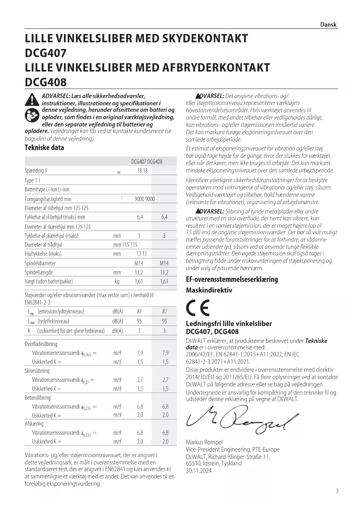 Ledningsfri lille vinkelsliber DCG407, DCG408 DeWALT erklærer, at produkterne beskrevet under Tekniske data er i overensstemmelse med: 2006/42/EF, EN 62841‑1:2015+A11:2022; EN IEC 62841‑2‑3:2021+A11:2021.Disse produkter er endvidere i overensstemmelse med direktiv 2014/30/EU og 2011/65/EU. Få flere oplysninger ved at kontakte DeWALT på følgende adresse eller se bag påvejledningen.Undertegnede er ansvarlig for kompilering af den tekniske fil og udsteder denne erklæring på vegne afDeWALT.Markus Rompel Vice‑President Engineering, PTE‑Europe DeWALT, Richard‑Klinger‑Straße 11, 65510, Idstein, Tyskland 30.11.2024 ADVARSEL: Det angivne vibrations- og/eller støjemissionsniveau repræsenterer værktøjets hovedanvendelsesområder. Hvis værktøjet anvendes til andre formål, med andet tilbehør eller vedligeholdes dårligt, kan vibrations- og/eller støjemissionen imidlertid variere. Det kan markant forøge eksponeringsniveauet over den samledearbejdsperiode.Et estimat af eksponeringsniveauet for vibration og/eller støj bør også tage højde for de gange, hvor der slukkes for værktøjet, eller når det kører, men ikke bruges til arbejde. Det kan markant mindske eksponeringsniveauet over den samledearbejdsperiode.Identificer yderligere sikkerhedsforanstaltninger for at beskytte operatøren mod virkningerne af vibrationer og/eller støj, såsom: Vedligehold værktøjet og tilbehør, hold hænderne varme (relevante for vibrationer), organisering afarbejdsmønstre. ADVARSEL: Slibning af tynde metalplader eller andre strukturer med en stor overflade, der nemt kan vibrere, kan resultere i en samlet støjemission, der er meget højere (op til 15dB) end de angivne støjemissionsværdier. Der bør så vidt muligt træffes passende foranstaltninger for at forhindre, at sådanne emner udsender lyd, såsom ved at anvende tunge fleksible dæmpningsmåtter. Den øgede støjemission skal også tages i betragtning både under risikovurderingen af støjeksponering og under valg af passendehøreværn.Vibrations‑ og/eller støjemissionsniveauet, der er angivet i dette vejledningsark, er målt i overensstemmelse med en standardiseret test, der er angivet i EN62841 og kan anvendes til at sammenligne et værktøj med et andet. Det kan anvendes til en foreløbigeksponeringsvurdering.DCG407 DCG408Spænding V 18 18Type 1 1Batteritype Li‑ion Li‑ionTomgangshastighed min 9000 9000Diameter af slibehjul mm 125 125Tykkelse af slibehjul (maks) mm 6,4 6,4 Diameter af skærehjul mm 125 125Tykkelse af skærehjul (maks) mm