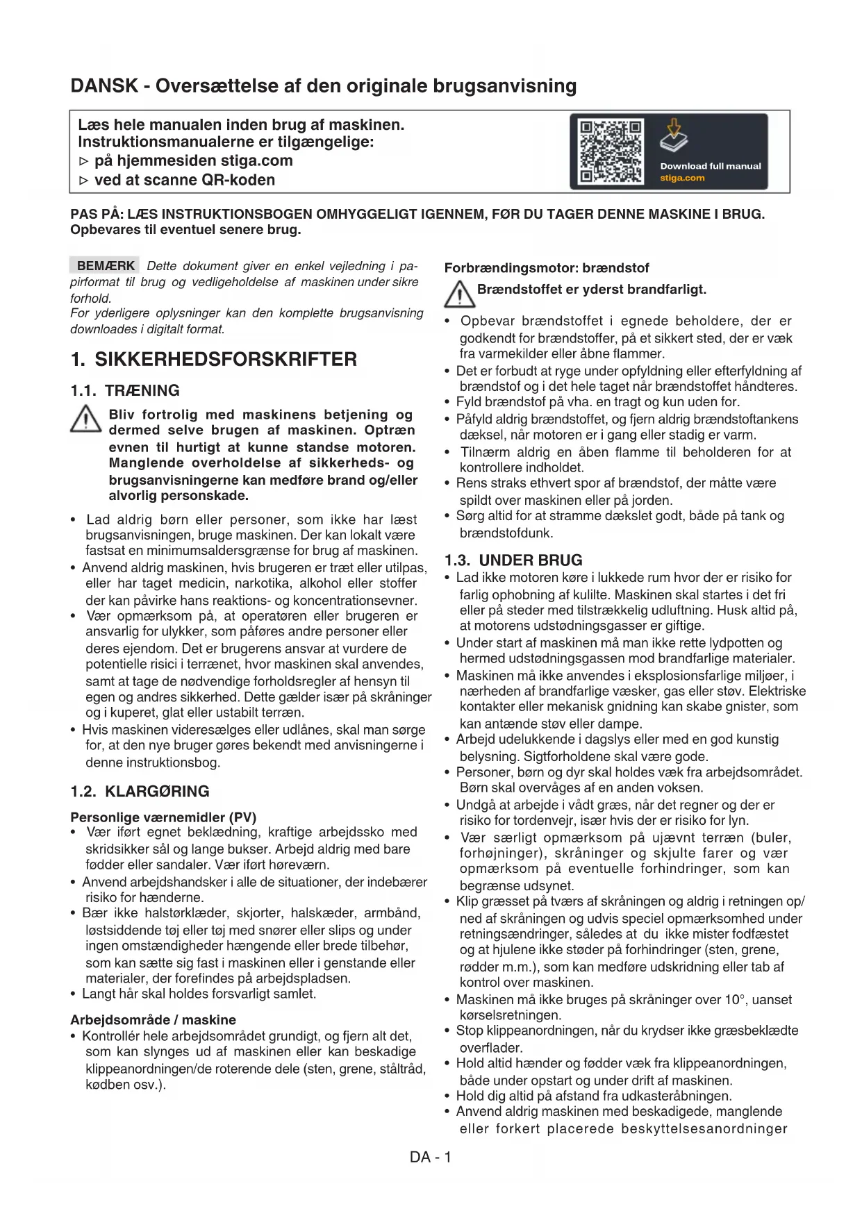 1.1. TRÆNING Bliv fortrolig med maskinens betjening og dermed selve brugen af maskinen. Optræn evnen til hurtigt at kunne standse motoren. Manglende overholdelse af sikkerheds- og brugsanvisningerne kan medføre brand og/eller alvorlig personskade.