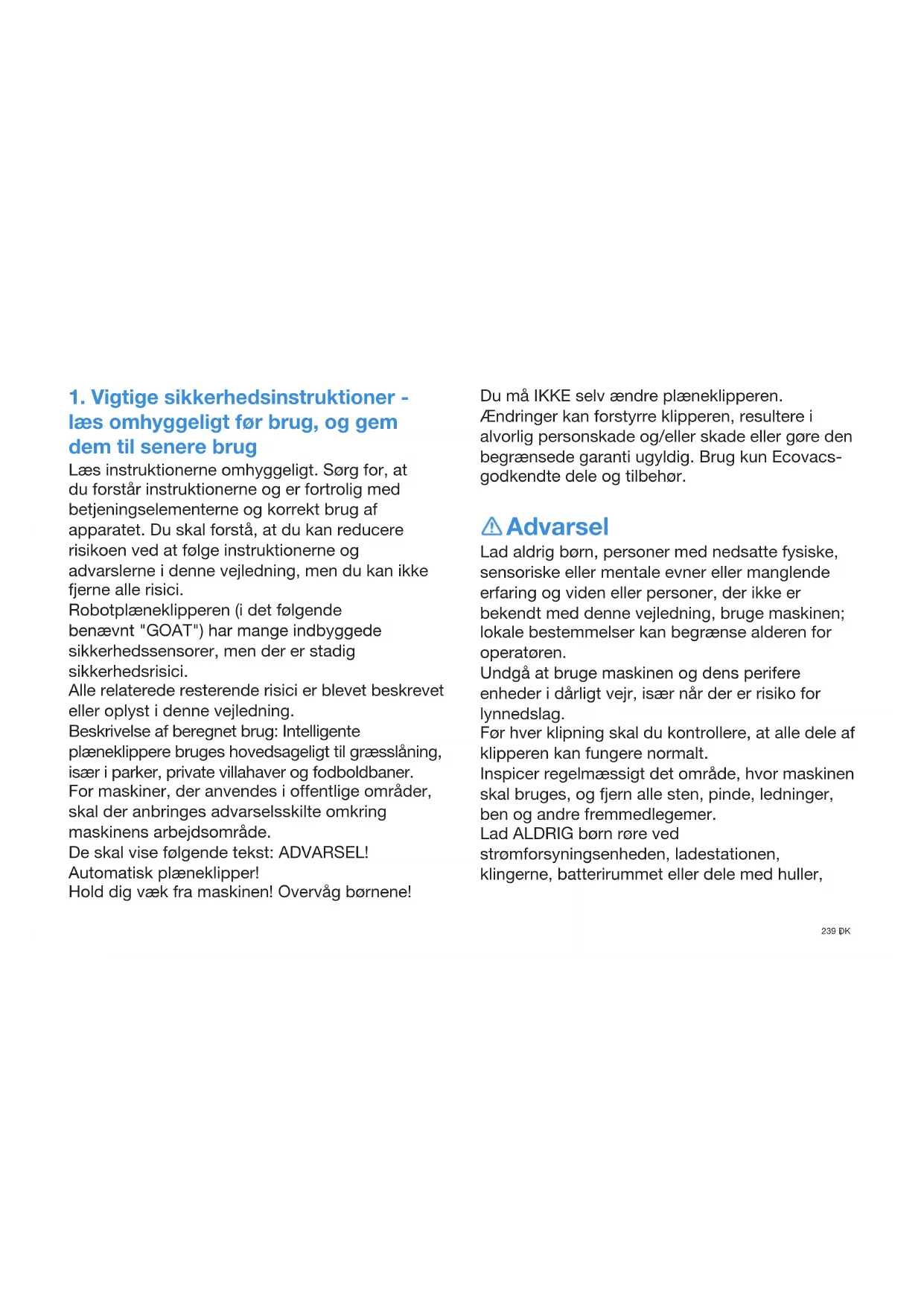 læs omhyggeligt før brug, og gem dem til senere brug Læs instruktionerne omhyggeligt Sørg for, at du forstår instruktionerne og er fortrolig med betjeningselementerne og korrekt brug af apparatet Du skal forstå, at du kan reducere risikoen ved at følge instruktionerne og advarslerne i denne vejledning, men du kan ikke fjerne alle risici Robotplæneklipperen (i det følgende benævnt "GOAT") har mange indbyggede sikkerhedssensorer, men der er stadig sikkerhedsrisici Alle relaterede resterende risici er blevet beskrevet eller oplyst i denne vejledning Beskrivelse af beregnet brug: Intelligente plæneklippere bruges hovedsageligt til græsslåning, især i parker, private villahaver og fodboldbaner For maskiner, der anvendes i offentlige områder, skal der anbringes advarselsskilte omkring maskinens arbejdsområde De skal vise følgende tekst: ADVARSEL! Automatisk plæneklipper! Hold dig væk fra maskinen! Overvåg børnene! Du må IKKE selv ændre plæneklipperen Ændringer kan forstyrre klipperen, resultere i alvorlig personskade og/eller skade eller gøre den begrænsede garanti ugyldig Brug kun Ecovacs- godkendte dele og tilbehør Advarsel Lad aldrig børn, personer med nedsatte fysiske, sensoriske eller mentale evner eller manglende erfaring og viden eller personer, der ikke er bekendt med denne vejledning, bruge maskinen; lokale bestemmelser kan begrænse alderen for operatøren Undgå at bruge maskinen og dens perifere enheder i dårligt vejr, især når der er risiko for lynnedslag Før hver klipning skal du kontrollere, at alle dele af klipperen kan fungere normalt Inspicer regelmæssigt det område, hvor maskinen skal bruges, og fjern alle sten, pinde, ledninger, ben og andre fremmedlegemer Lad ALDRIG børn røre ved strømforsyningsenheden, ladestationen, klingerne, batterirummet eller dele med huller,240DK feks hjulene Advarsel Betjen aldrig maskinen og/eller dens perifere enheder med defekte beskyttelsesanordninger eller skjolde eller uden sikkerhedsanordninger, eller hvis ledningen er beskadiget eller slidt Hold dig væk fra de roterende klinger! Sæt IKKE hænder eller fødder under eller i nærheden af de roterende klinger Hold en sikker afstand til plæneklipperen, når den arbejder Du må IKKE overreagere Hold hele tiden balancen, og vær altid sikker på fodfæstet på skråninger Gå, men løb aldrig, mens du betjener maskinen eller dens periferiudstyr Advarsel Lad aldrig børn være i nærheden af maskinen eller lege med den, når den er i drift Advarsel Rør IKKE ved bevægelige, farlige dele, før de er standset helt Advarsel Til opladning af batteriet må du kun bruge den aftagelige strømforsyningsenhed, der følger med dette apparat (CH2492E/CH2492F) Dette apparat indeholder batterier, som kun må udskiftes af faglærte personer Sikker brug: Det er forbudt at tilslutte en beskadiget ledning til strømforsyningen eller at røre ved en beskadiget ledning, før den er afbrudt fra strømforsyningen, da beskadigede ledninger kan føre til kontakt med spændingsførende dele; hold forlængerledninger væk fra bevægelige farlige dele for at undgå skader på ledningerne, som kan føre til kontakt med strømførende dele; tilslut kun maskinen og/ eller dens perifere enheder til et strømkredsløb, der er beskyttet af en fejlstrømsafbryder (RCD) med en udløsningsstrøm på højst 30 mA Tag strømforsyningen ud af stikkontakten, og vikl strømkablet eller forlængerledningen fra hinanden, hvis de er blevet viklet ind i hinanden eller beskadiget under brug Træk i stikkontaktens krop i stedet for i ledningen under betjeningen for at undgå fare Kontakt kundeservice, og lad en241 DK fagmand reparere eller udskifte ledningen Brug forlængerledningen fremstillet af ECOVACS Kontakt kundeservice i tilfælde af problemer Hvis FORSYNINGSKABLET er beskadiget, skal det udskiftes af producenten, dennes serviceagent eller tilsvarende kvalicerede personer for at undgå fare Tryk på STOP-knappen med det samme, når plæneklipperen afgiver en unormal lyd eller udløser alarm I tilfælde af udsivning af elektrolyt skylles der med vand eller neutraliserende middel, og der skal søges lægehjælp, hvis det kommer i kontakt med øjnene, osv Ved unormale vibrationer genstartes plæneklipperen Hvis problemet fortsætter, skal du kontakte kundeservice Instruktioner om altid at bære kraftigt fodtøj og lange bukser, mens maskinen betjenes med en manuel styring. Derudover ved brug af den manuelle styring a) Klip kun i dagslys eller i godt kunstigt lys b) Undlad at bruge maskinen i vådt græs c) Betjen ikke maskinen barfodet eller i åbne sandaler Bær altid kraftigt fodtøj og lange bukser d) Vær altid sikker på at have et godt fodfæste på skråninger e) Vær yderst forsigtig, når du bakker med maskinen mod dig f) Tænd altid for motoren i henhold til instruktionerne med fødderne langt væk fra klingen(klingerne) Opdatering af enheden Nogle enheder opdateres typisk hver anden måned, men det er ikke altid så specikt Nogle enheder, især dem, der blev sat til salg for mere end tre år siden, vil kun blive opdateret, hvis der ndes og rettes en kritisk sårbarhed Må ikke bruges eller opbevares i ekstremt varme eller kolde omgivelser (under 5˚C /41˚F eller over 45˚C/113˚F) Dette udstyr skal installeres og betjenes i overensstemmelse med de medfølgende instruktioner, og den eller de antenner, der bruges til denne sender, skal installeres, så der er en afstand på mindst 20 cm til alle personer, og de må ikke placeres eller betjenes sammen med andre antenner eller sendere242DK brugte batterier Dette symbol betyder, at udtjente batterier og akkumulatorer ikke må blandes med usorteret husholdningsaffald Din deltagelse er en vigtig del af indsatsen for at minimere batteriers og akkumulatorers påvirkning af miljøet og menneskers sundhed For korrekt genbrug kan du returnere dette produkt eller de batterier eller akkumulatorer, det indeholder, til din leverandør eller til et udp