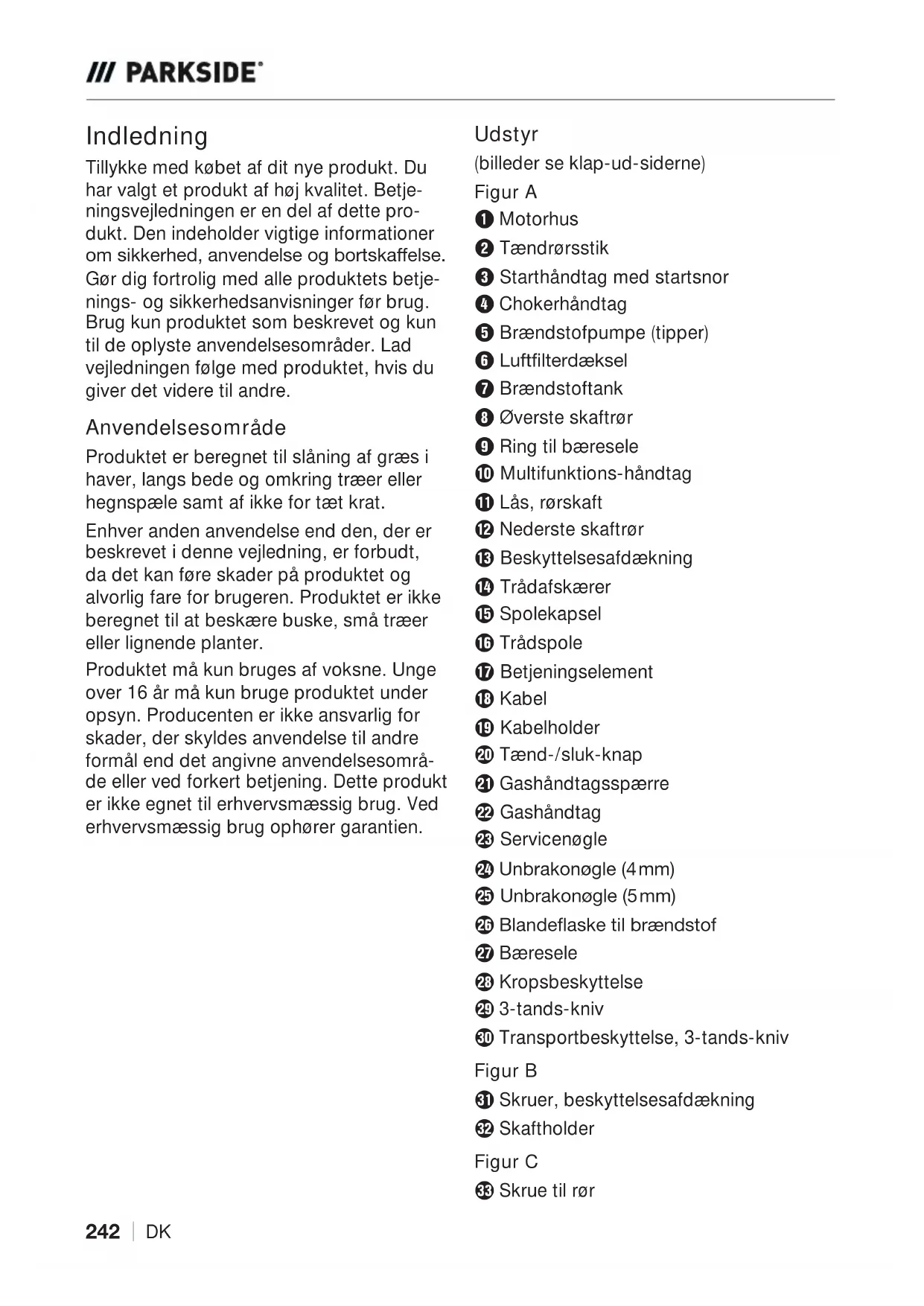 ֺDK Indledning Tillykke med købet af dit nye produkt. Du har valgt et produkt af høj kvalitet. Betje- ningsvejledningen er en del af dette pro- dukt. Den indeholder vigtige informationer RPVLNNHUKHGDQYHQGHOVHRJERUWVNDƙHOVH Gør dig fortrolig med alle produktets betje- nings- og sikkerhedsanvisninger før brug. Brug kun produktet som beskrevet og kun til de oplyste anvendelsesområder. Lad vejledningen følge med produktet, hvis du giver det videre til andre. Anvendelsesområde Produktet er beregnet til slåning af græs i haver, langs bede og omkring træer eller hegnspæle samt af ikke for tæt krat. Enhver anden anvendelse end den, der er beskrevet i denne vejledning, er forbudt, da det kan føre skader på produktet og alvorlig fare for brugeren. Produktet er ikke beregnet til at beskære buske, små træer eller lignende planter. Produktet må kun bruges af voksne. Unge over 16 år må kun bruge produktet under opsyn. Producenten er ikke ansvarlig for skader, der skyldes anvendelse til andre formål end det angivne anvendelsesområ- de eller ved forkert betjening. Dette produkt er ikke egnet til erhvervsmæssig brug. Ved erhvervsmæssig brug ophører garantien. Udstyr (billeder se klap-ud-siderne) Figur A 1 Motorhus 2 Tændrørsstik 3 Starthåndtag med startsnor 4 Chokerhåndtag 5 Brændstofpumpe (tipper) 6 /XIWƞOWHUGđNVHO 7 Brændstoftank 8 Øverste skaftrør 9 Ring til bæresele 0 Multifunktions-håndtag q Lås, rørskaft w Nederste skaftrør e Beskyttelsesafdækning r Trådafskærer t Spolekapsel z Trådspole u Betjeningselement i Kabel o Kabelholder p Tænd-/sluk-knap a Gashåndtagsspærre s Gashåndtag d Servicenøgle