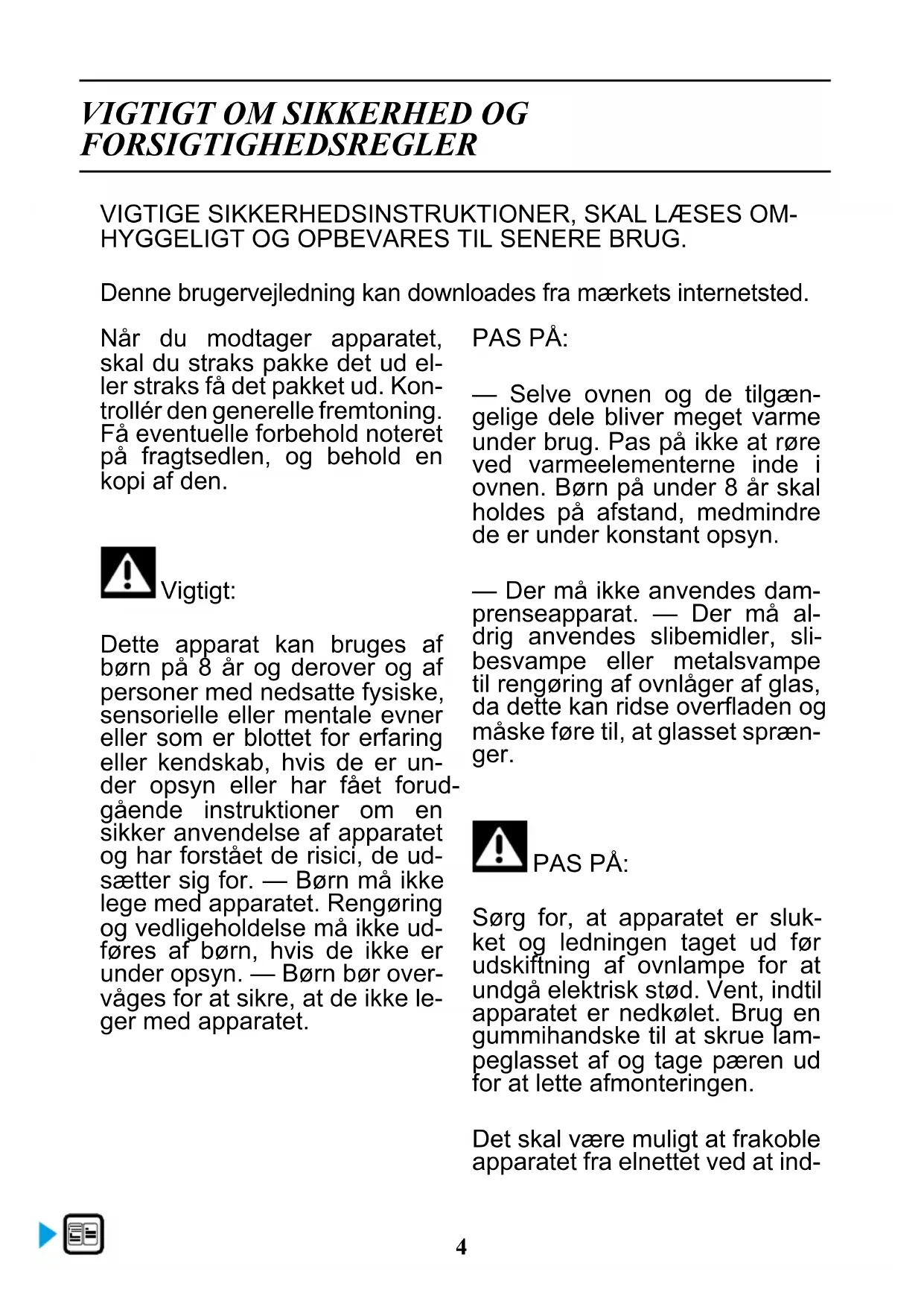Dette apparat kan bruges af børn på 8år og derover og af personer med nedsatte fysiske, sensorielle eller mentale evner aller som er blottet for erfaring aller kendskap, hvis de er under opsyn aller har fæt forudgående instruktioner om en sikker anvendelse af apparatet og har forstæt de risici, de ud-sætter sig for. — Børn@må ikke lege med apparatet. Rengøring og vedligeholdelse må ikke ud-fores af børn, hvis de ikke er under opsyn. — Børn bør overvåges for at sikre, at de ikke legger med apparatet.