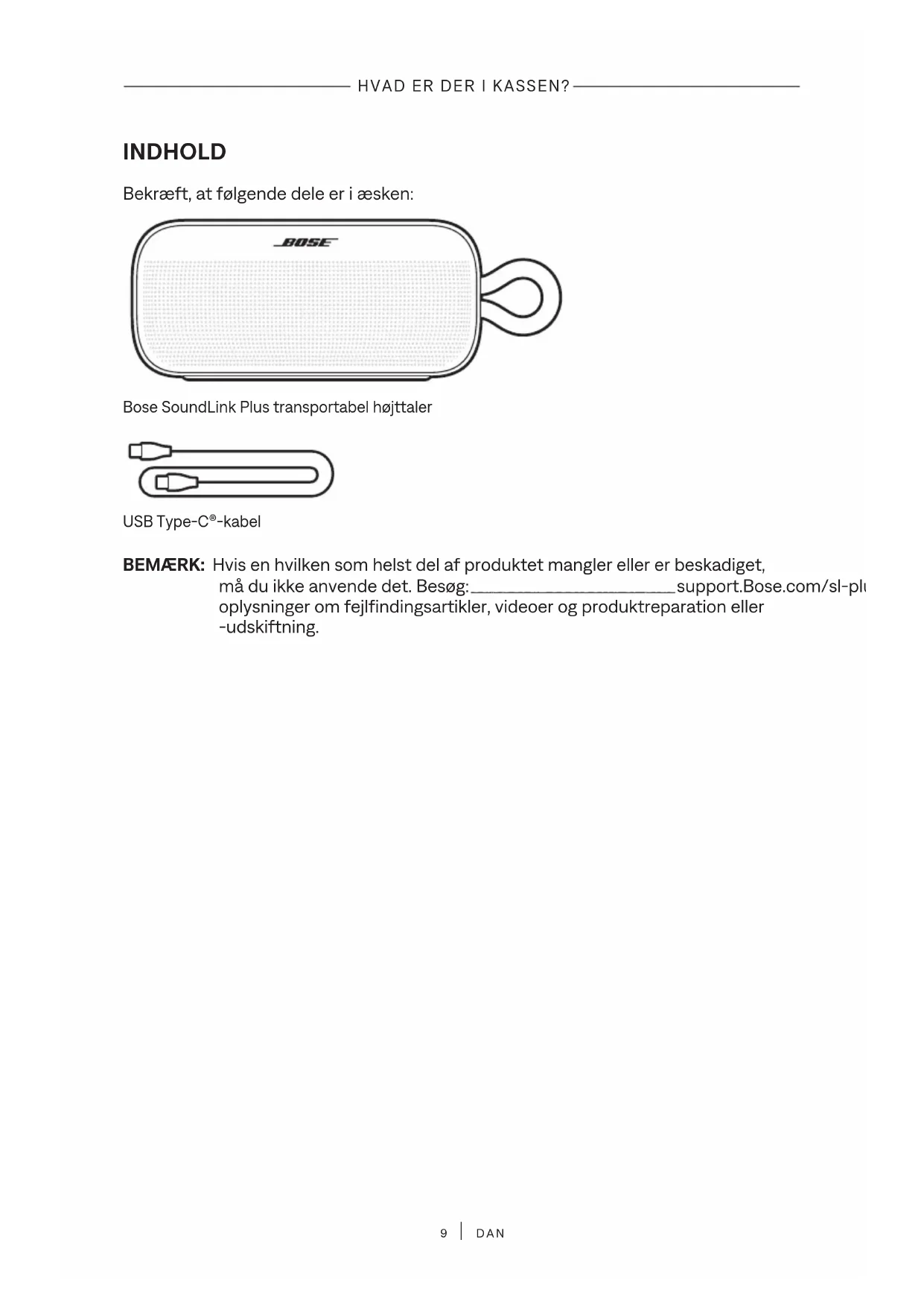 DAN HVAD ER DER I KASSEN? INDHOLD Bekræft, at følgende dele er i æsken: Bose SoundLink Plus transportabel højttaler USB Type-C®-kabel BEMÆRK: Hvis en hvilken som helst del af produktet mangler eller er beskadiget, må du ikke anvende det. Besøg: support.Bose.com/sl-plussupport.Bose.com/sl-plus for at finde oplysninger om fejlfindingsartikler, videoer og produktreparation eller -udskiftning.10