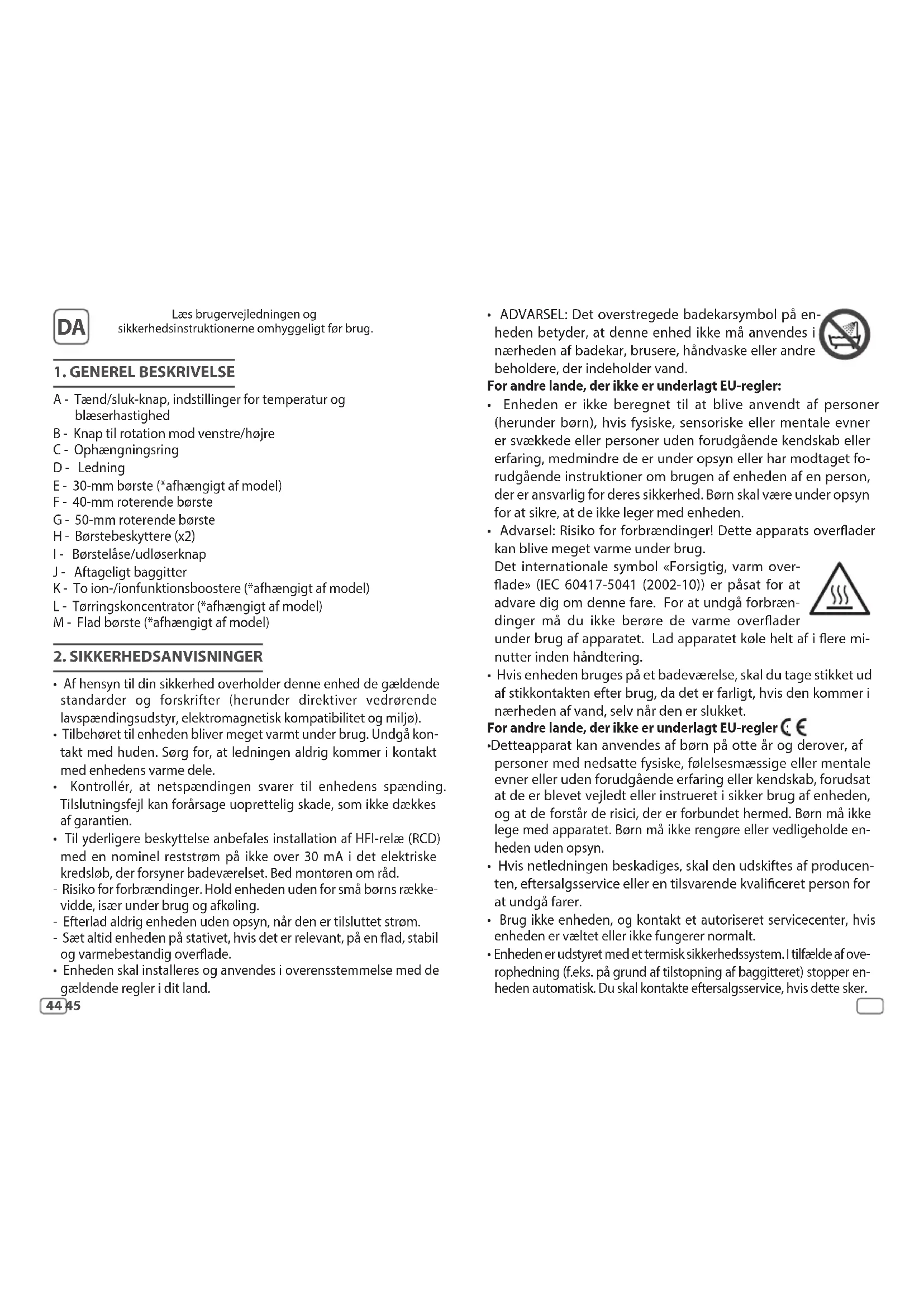 - Til yderligere beskyttelse anbefales installation af HFI-relæ (RCD) med en nominel reststrøm på ikke over 30 mA i det elektriske kredsløb, der forsyner badeværelset. Bed montøren om råd. - Risiko for forbrændinger. Hold enheden uden for små børns række- vidde, især under brug og afkøling. - Efterlad aldrig enheden uden opsyn, når den er tilsluttet strøm. - Sæt altid enheden på stativet, hvis det er relevant, på en ad, stabil og varmebestandig overade.