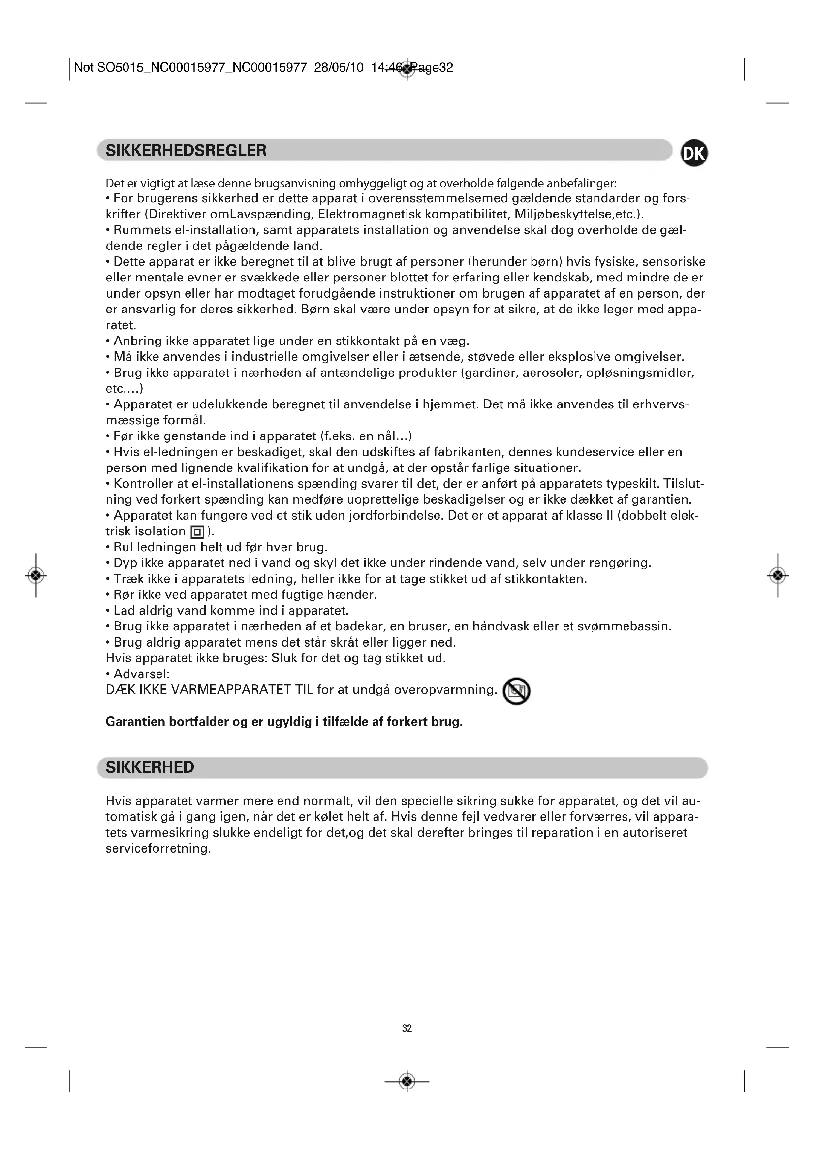 Not SO5015_NC00015977_NC00015977 28/05/10 14:46 Page31SIKKERHEDSREGLER Det er vigtigt at læse denne brugsanvisning omhyggeligt og at overholde følgende anbefalinger: