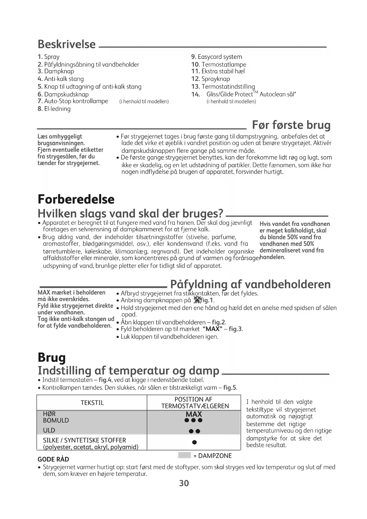- Indstil temperaturen i henhold til det tekstil, der stryges.• Anbring dampknappen på – fig.1.• Du kan stryge, når kontrollampen slukkes. Ekstrafunktioner Gliss/Glide Protect