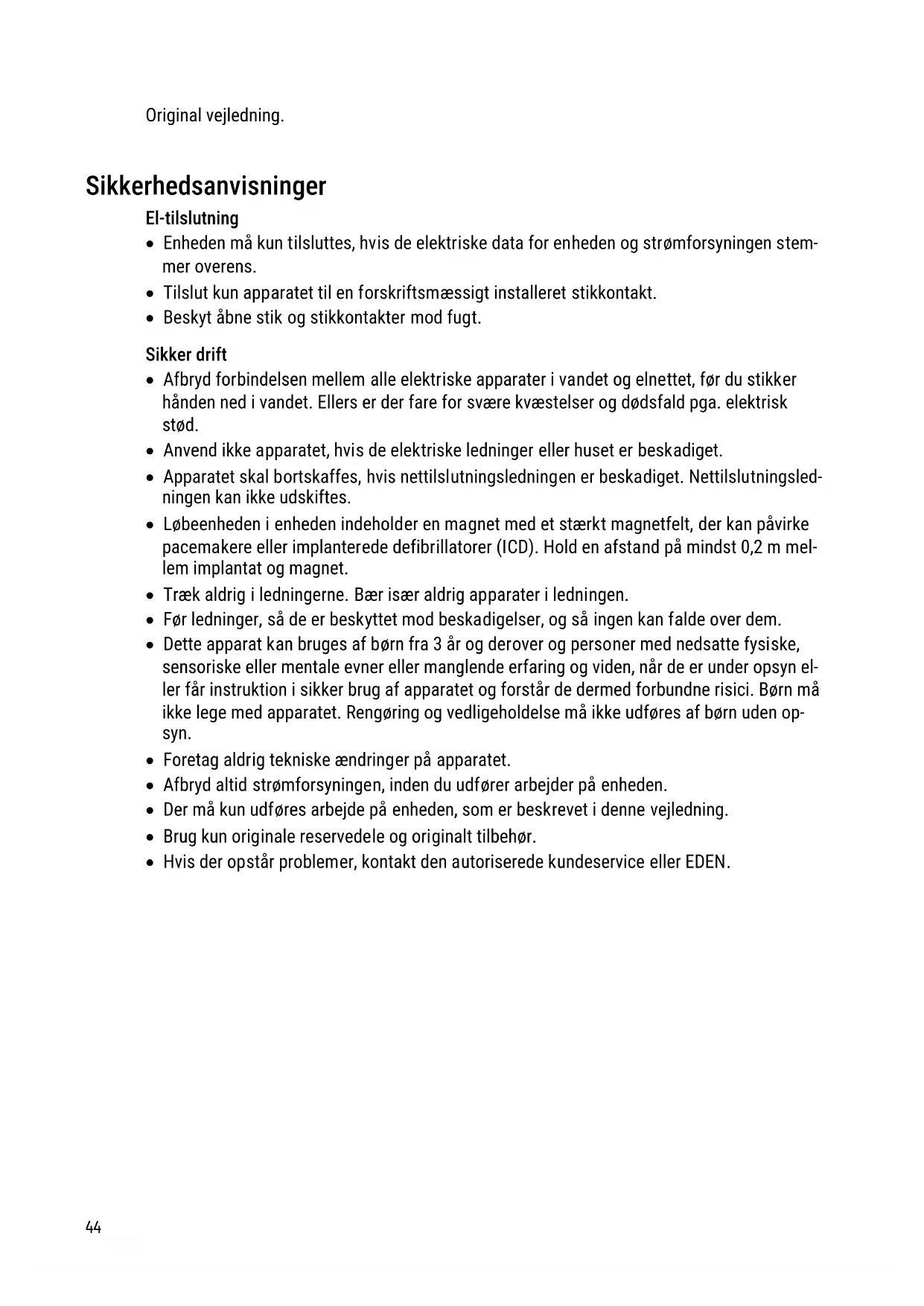- Hvis der opstår problemer, kontakt den autoriserede kundeservice eller EDEN.DE