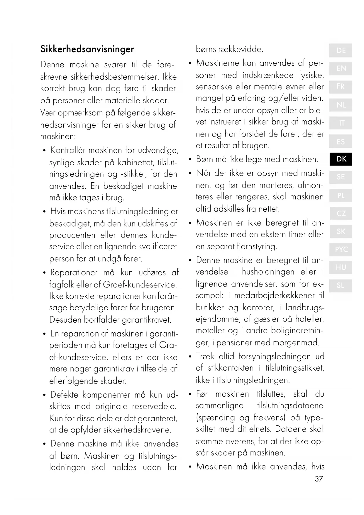 - Reparationer må kun udføres af fagfolk eller af Graef-kundeservice. Ikke korrekte reparationer kan forår- sage betydelige farer for brugeren. Desuden bortfalder garantikravet.