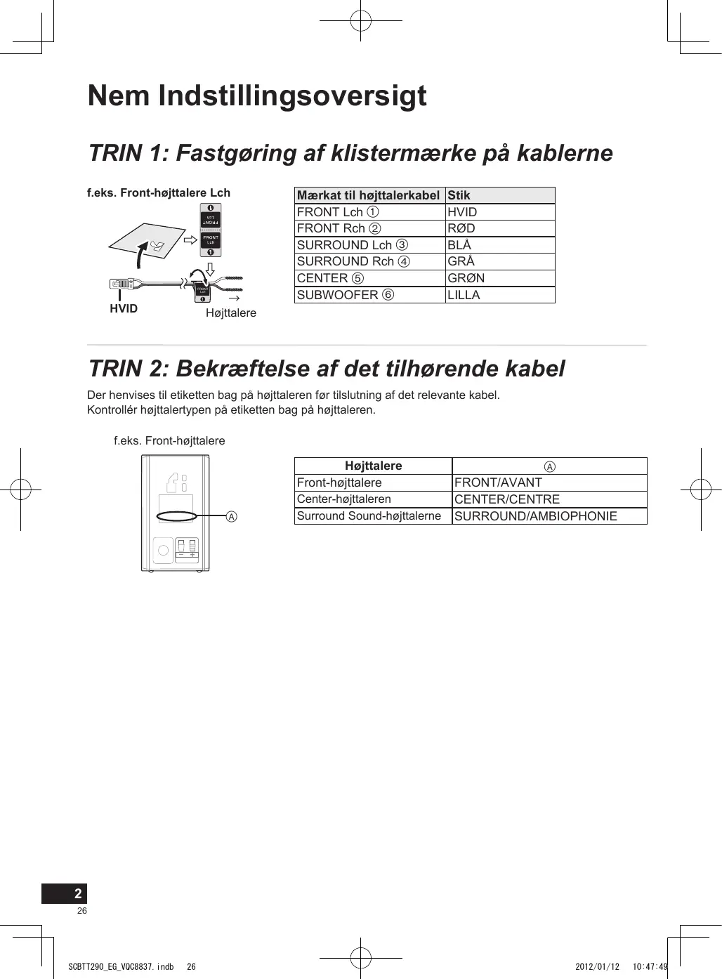 2012/01/12 10:47:49 Nem Indstillingsoversigt TRIN 1: Fastgøring af klistermærke på kablerne f.eks. Front-højttalere Lch FRONT Lch