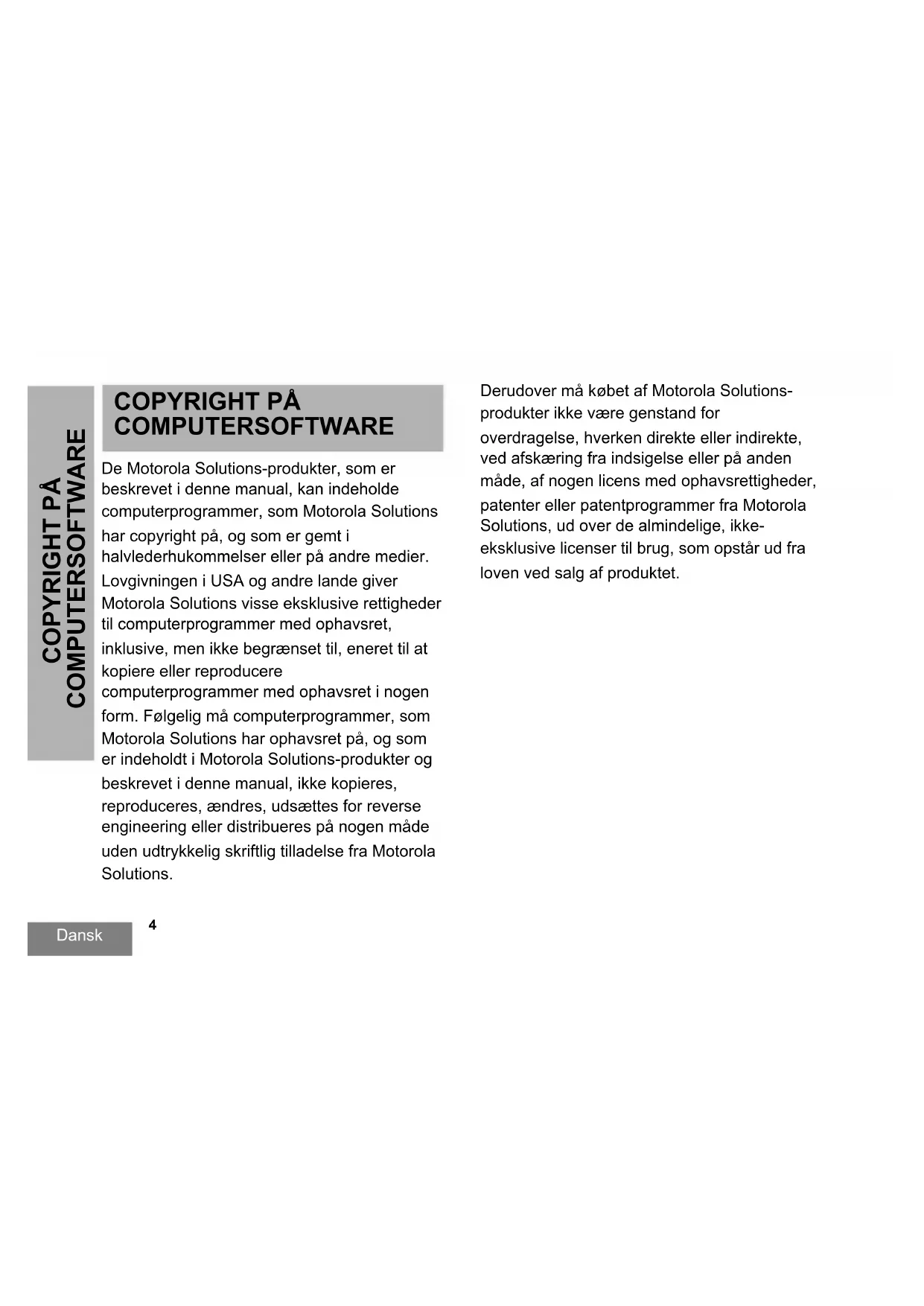 COPYRIGHT PÅ COMPUTERSOFTWARE COPYRIGHT PÅ COMPUTERSOFTWARE De Motorola Solutions-produkter, som er beskrevet i denne manual, kan indeholde computerprogrammer, som Motorola Solutions har copyright på, og som er gemt i halvlederhukommelser eller på andre medier. Lovgivningen i USA og andre lande giver Motorola Solutions visse eksklusive rettigheder til computerprogrammer med ophavsret, inklusive, men ikke begrænset til, eneret til at kopiere eller reproducere computerprogrammer med ophavsret i nogen form. Følgelig må computerprogrammer, som Motorola Solutions har ophavsret på, og som er indeholdt i Motorola Solutions-produkter og beskrevet i denne manual, ikke kopieres, reproduceres, ændres, udsættes for reverse engineering eller distribueres på nogen måde uden udtrykkelig skriftlig tilladelse fra Motorola Solutions. Derudover må købet af Motorola Solutions- produkter ikke være genstand for overdragelse, hverken direkte eller indirekte, ved afskæring fra indsigelse eller på anden måde, af nogen licens med ophavsrettigheder, patenter eller patentprogrammer fra Motorola Solutions, ud over de almindelige, ikke- eksklusive licenser til brug, som opstår ud fra loven ved salg af produktet. 63M03_A_BRCAN_da.book Page 4 Monday, November 19, 2018 9:18 AMDansk