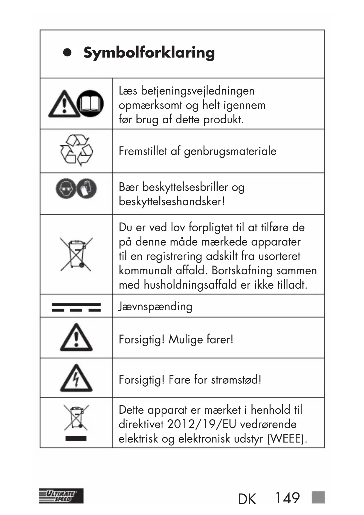 z Symbolforklaring Læs betjeningsvejledningen opmærksomt og helt igennem før brug af dette produkt. Fremstillet af genbrugsmateriale Bær beskyttelsesbriller og beskyttelseshandsker! Du er ved lov forpligtet til at tilføre de på denne måde mærkede apparater til en registrering adskilt fra usorteret kommunalt affald. Bortskafning sammen med husholdningsaffald er ikke tilladt. Jævnspænding Forsigtig! Mulige farer! Forsigtig! Fare for strømstød! Dette apparat er mærket i henhold til direktivet 2012/19/EU vedrørende elektrisk og elektronisk udstyr (WEEE).150