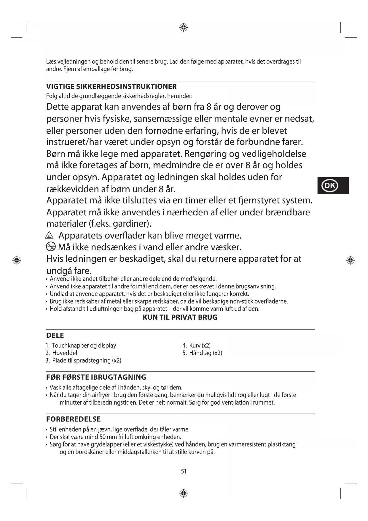 - Når du tager din airfryer i brug den første gang, bemærker du muligvis lidt røg eller lugt i de første minutter af tilberedningstiden. Det er helt normalt. Sørg for god ventilation i rummet. FORBEREDELSE