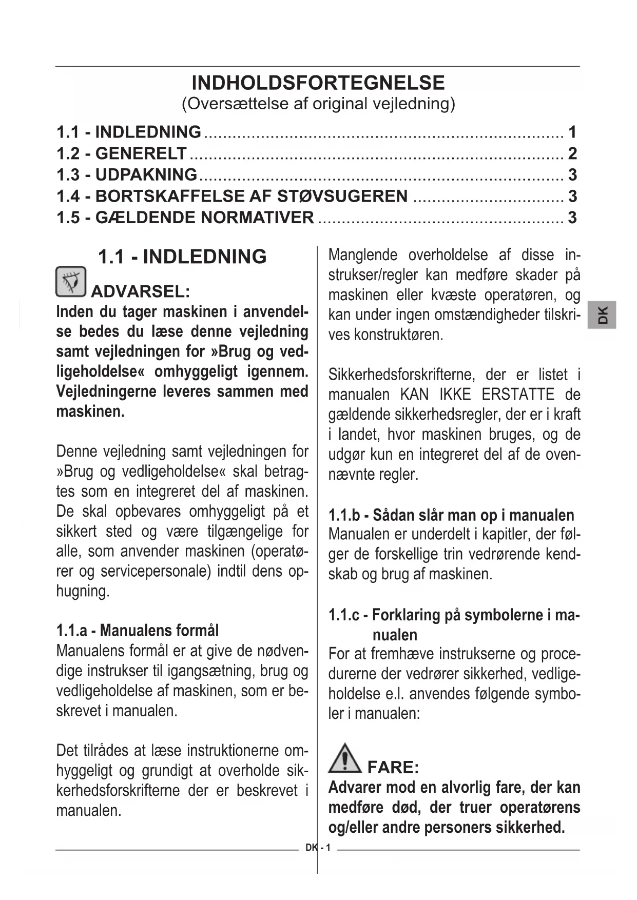 nualen For at fremhæve instrukserne og proce- durerne der vedrører sikkerhed, vedlige- holdelse e.l. anvendes følgende symbo- ler i manualen: FARE: Advarer mod en alvorlig fare, der kan medføre død, der truer operatørens og/eller andre personers sikkerhed. INDHOLDSFORTEGNELSE (Oversættelse af original vejledning)
