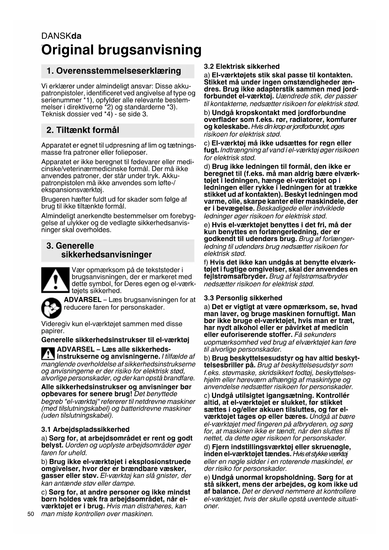 daDansk Original brugsanvisning Vi erklærer under almindeligt ansvar: Disse akku- patronpistoler, identificeret ved angivelse af type og serienummer *1), opfylder alle relevante bestem- melser i direktiverne *2) og standarderne *3). Teknisk dossier ved *4) - se side 3. Apparatet er egnet til udpresning af lim og tætnings- masse fra patroner eller folieposer. Apparatet er ikke beregnet til fødevarer eller medi- cinske/veterinærmedicinske formål. Der må ikke anvendes patroner, der står under tryk. Akku- patronpistolen må ikke anvendes som løfte-/ ekspansionsværktøj. Brugeren hæfter fuldt ud for skader som følge af brug til ikke tiltænkte formål. Almindeligt anerkendte bestemmelser om forebyg- gelse af ulykker og de vedlagte sikkerhedsanvis- ninger skal overholdes. Vær opmærksom på de tekststeder i brugsanvisningen, der er markeret med dette symbol, for Deres egen og el-værk- tøjets sikkerhed. ADVARSEL – Læs brugsanvisningen for at reducere faren for personskader. Videregiv kun el-værktøjet sammen med disse papirer. Generelle sikkerhedsinstrukser til el-værktøj ADVARSEL – Læs alle sikkerheds- instrukserne og anvisningerne. I tilfælde af manglende overholdelse af sikkerhedsinstrukserne og anvisningerne er der risiko for elektrisk stød, alvorlige personskader, og der kan opstå brandfare. Alle sikkerhedsinstrukser og anvisninger bør opbevares for senere brug! Det benyttede begreb "el-værktøj" refererer til netdrevne maskiner (med tilslutningskabel) og batteridrevne maskiner (uden tilslutningskabel).