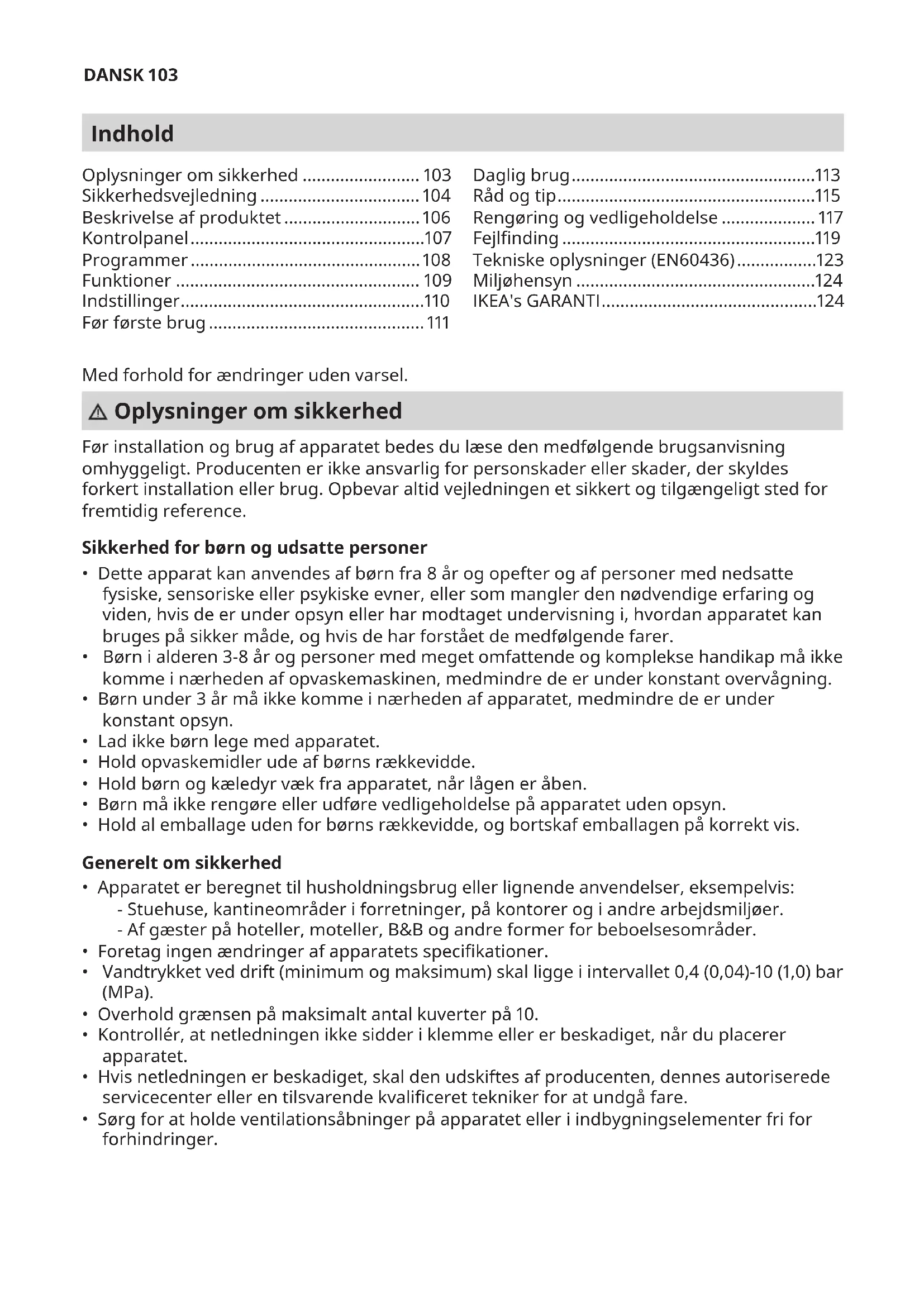 - Monteringsvejledningen og sikkerhedsoplysningerne i brugervejledningen. Eftersalgsservice for IKEA's apparater: Du kan altid kontakte IKEA's eftersalgsservice for at: anmode om service under garantien; bede om afklaring vedrørende installation af IKEA's apparater i IKEA's køkkener. Servicen kan ikke give afklaringer om: generel installation af IKEA's køkkener; eltilslutning (hvis maskinen leveres uden stik og netledning) samt tilslutning af vand og gas, da sådanne tilslutninger skal udføres af en autoriseret installatør. Bede om afklaring vedrørende indholdet i brugervejledninger og specikationer for IKEA's apparater. Læs omhyggeligt installationsvejledningen og/eller afsnittet med brugervejledning i denne brochure, før du kontakter os, så vi kan sikre, at du får den bedste hjælp. Tilgængelighed af reservedele Følgende dele kan fås i 7 år, efter at modellen er udgået: motor, cirkulations- og aftapningspumpe, varmeelementer, herunder varmepumper (adskilt eller medfølgende), rør og tilhørende udstyr, herunder alle slanger, ventiler, ltre og aquastop, strukturelle og indvendige dele til dørsamlinger (adskilt eller medfølgende), printkort, elektroniske skærme, trykafbrydere, termostater og sensorer, software og rmware, herunder software til nulstilling. Følgende dele kan fås i 10 år, efter at modellen er udgået: dørhængsel og tætningslister, andre tætningslister, spulearme, aøbsltre, indvendige hylder og plasttilbehør såsom kurve og dæksler. Kontakt IKEA's eftersalgsservice, hvis du skal bestille reservedele. Hvordan du kontakter du os i tilfælde af servicebehov Se sidste side i vejledningen med en komplet liste over IKEA's udpegede kontaktpersoner og tilhørende lokale telefonnumre. Vi anbefaler, at du bruger telefonnumrene bagerst i vejledningen, så vi kan give dig en hurtigere service. Referer altid til numrene i brochuren til apparatet, som du har brug for hjælp til. Hav IKEA's varenummer (kode på 8 cifre) og serienummeret (kode på 8 cifre på typepladen) til apparatet ved hånden, før du ringer til os om hjælp vedrørende apparatet. GEM KØBSKVITTERINGEN! Den er dit bevis på købet og er nødvendig for garantiens gyldighed. Bemærk, at kvitteringen også indeholder IKEA's varenavn og -nummer (kode på 8 cifre) på alle købte apparater. Har du brug for ekstra hjælp? Kontakt callcentret i vores nærmeste IKEA varehus, hvis du har yderligere spørgsmål, der ikke vedrører eftersalgsservice til dine apparater. Vi anbefaler, at du læser dokumentationen til produktet omhyggeligt igennem, inden du kontakter os.NORSK 127 Innhold Kan endres uten varsel. Sikkerhetsinformasjon Les instruksjonene nøye før du installerer og bruker apparatet. Produsenten er ikke ansvarlig for personskader eller skader som følger av feil installasjon eller bruk. Oppbevaralltid instruksjonene på et trygt sted for fremtidige oppslag. Sikkerhet for barn og utsatte personer