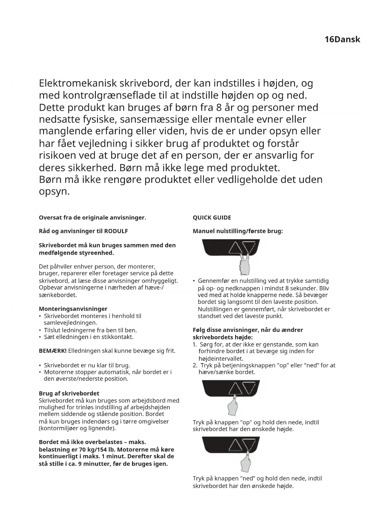 hæve/sænke bordet. Tryk på knappen "op" og hold den nede, indtil skrivebordet har den ønskede højde. Tryk på knappen "ned” og hold den nede, indtil skrivebordet har den ønskede højde. Elektromekanisk skrivebord, der kan indstilles i højden, og med kontrolgrænseade til at indstille højden op og ned. Dette produkt kan bruges af børn fra 8 år og personer med nedsatte fysiske, sansemæssige eller mentale evner eller manglende erfaring eller viden, hvis de er under opsyn eller har fået vejledning i sikker brug af produktet og forstår risikoen ved at bruge det af en person, der er ansvarlig for deres sikkerhed. Børn må ikke lege med produktet. Børn må ikke rengøre produktet eller vedligeholde det uden opsyn.17 For at få adgang til at køre helt op