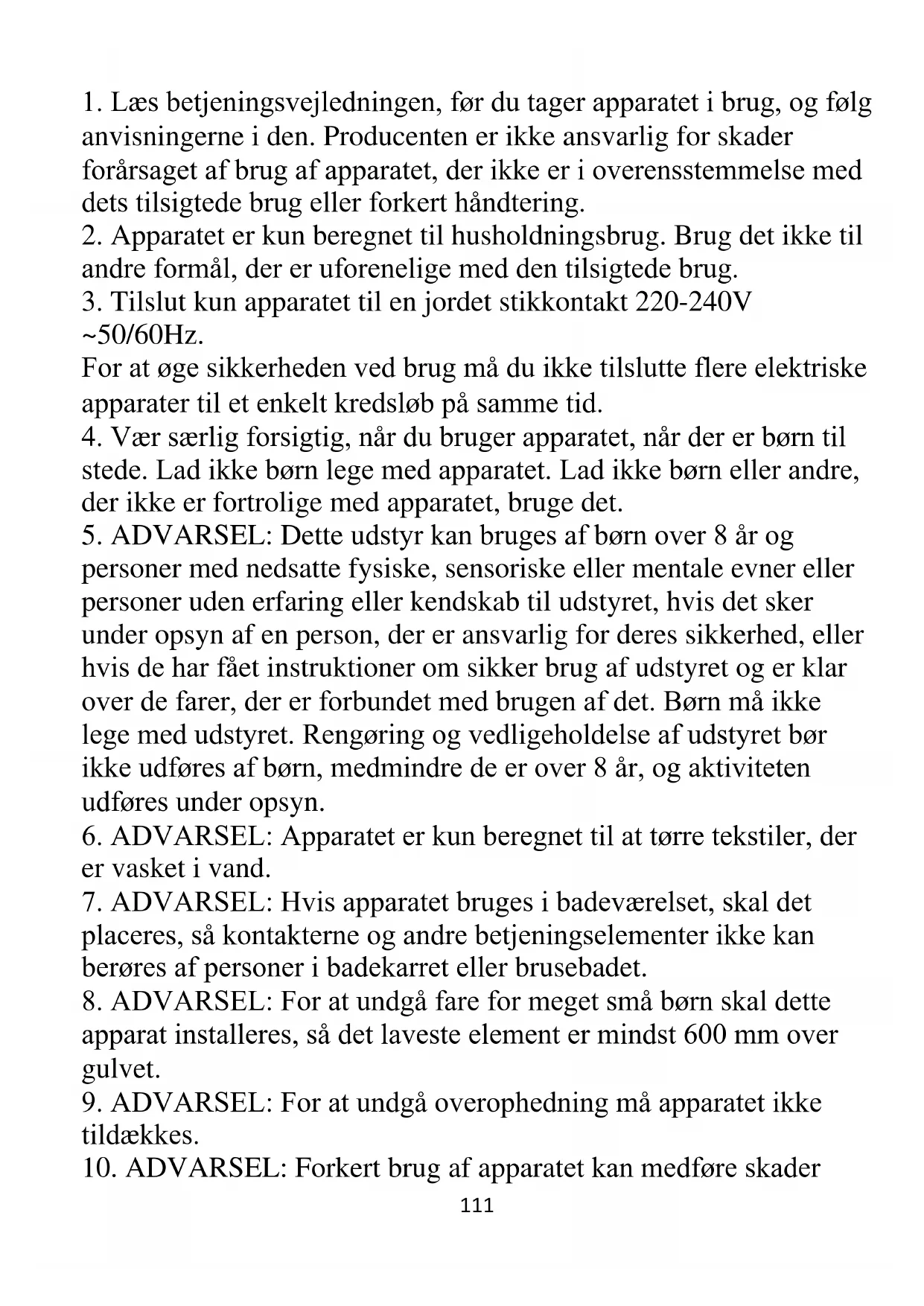 9. ADVARSEL: For at undgå overophedning må apparatet ikke