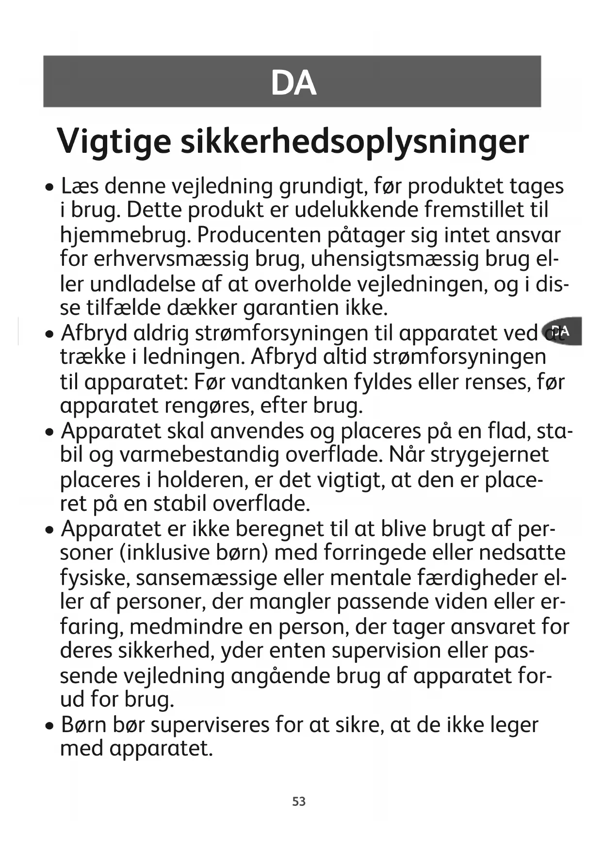 - Dampstrygejernet er et elektrisk apparat: Det skal anvendes under normale forhold. Det er ude- lukkende fremstillet til hjemmebrug.