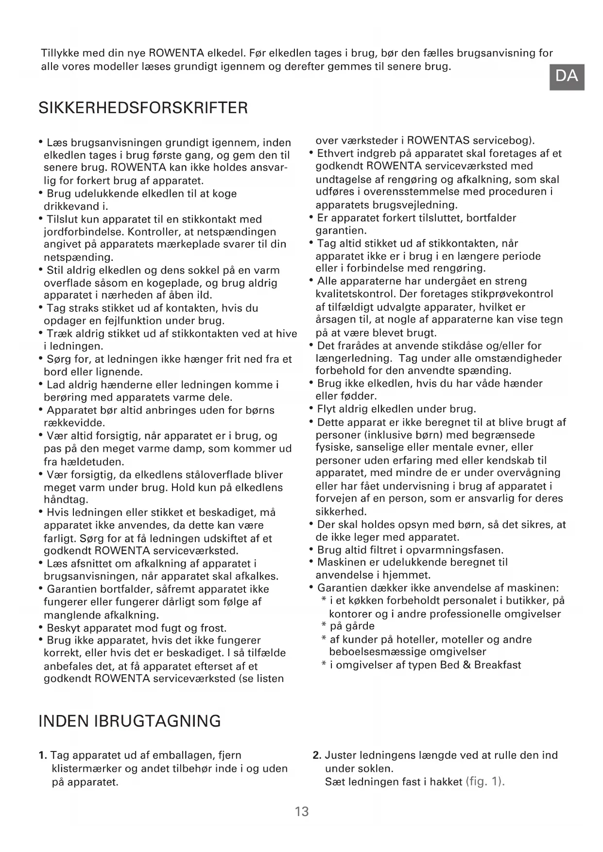- Læs brugsanvisningen grundigt igennem, inden elkedlen tages i brug første gang, og gem den til senere brug. ROWENTA kan ikke holdes ansvar- lig for forkert brug af apparatet.